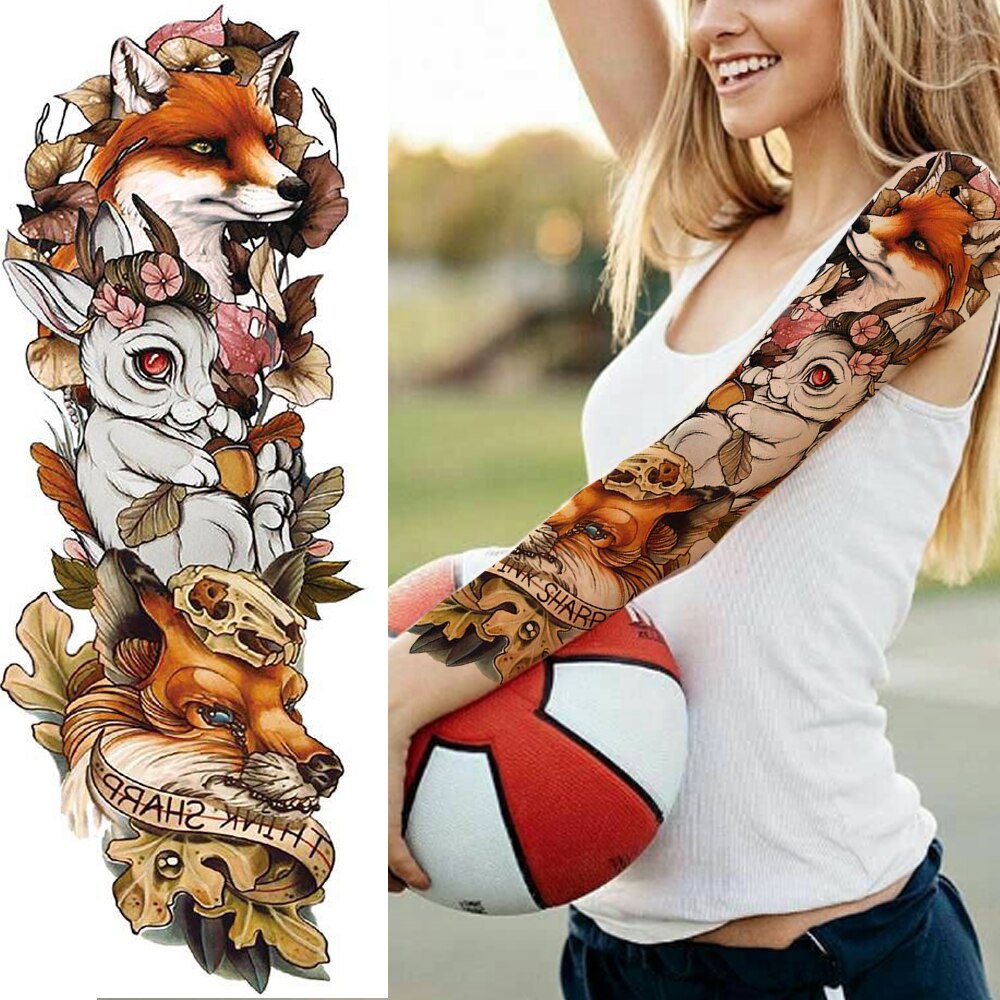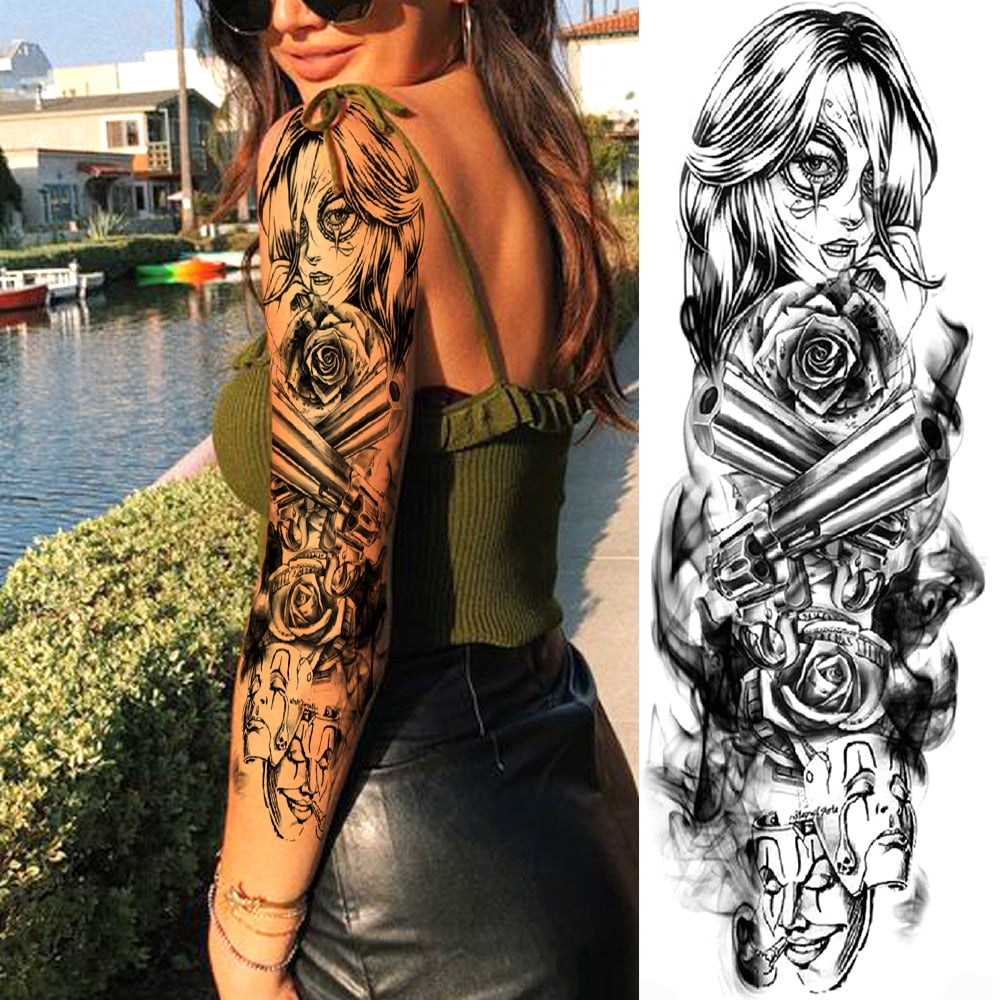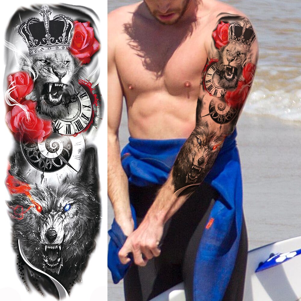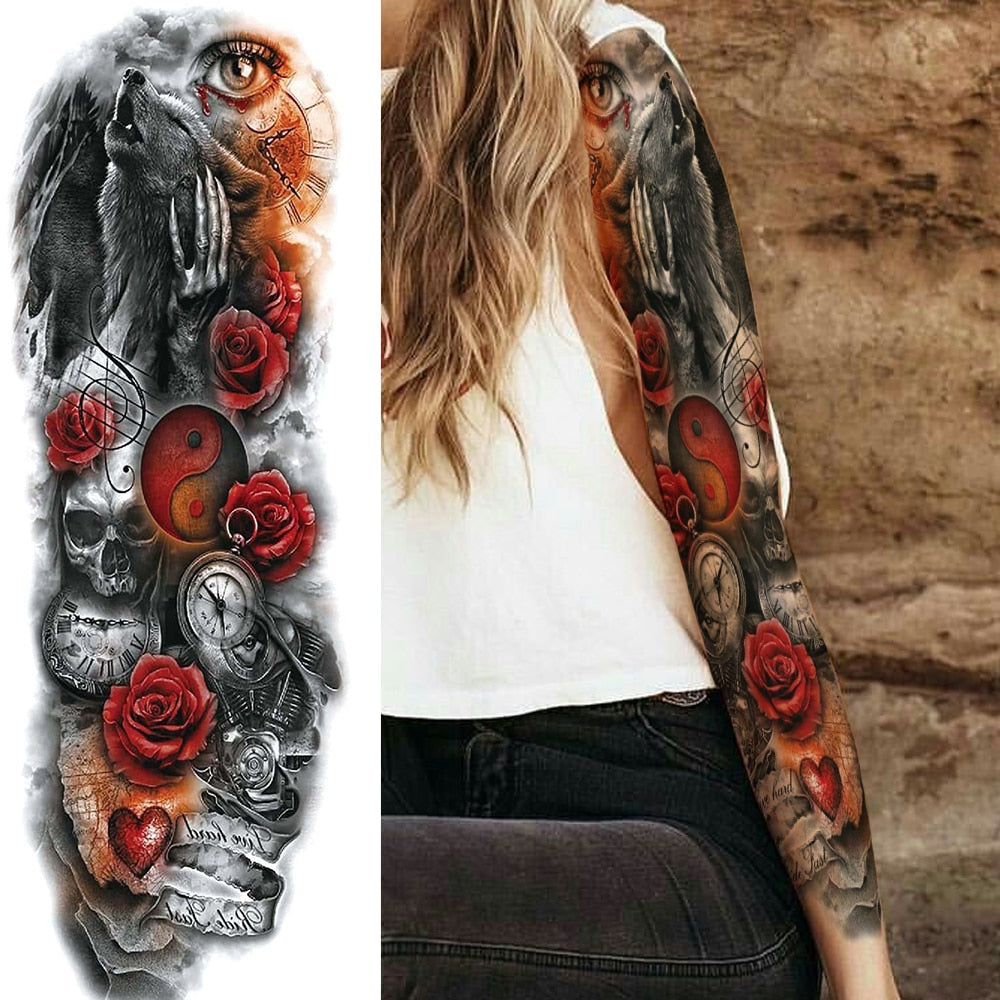 Sexy Long Full Arm Rose Clock Temporary Tattoos For Men Women Tatoo Body Leg Art Makeup Large Tiger Flower Fake Tattoo Stickers
