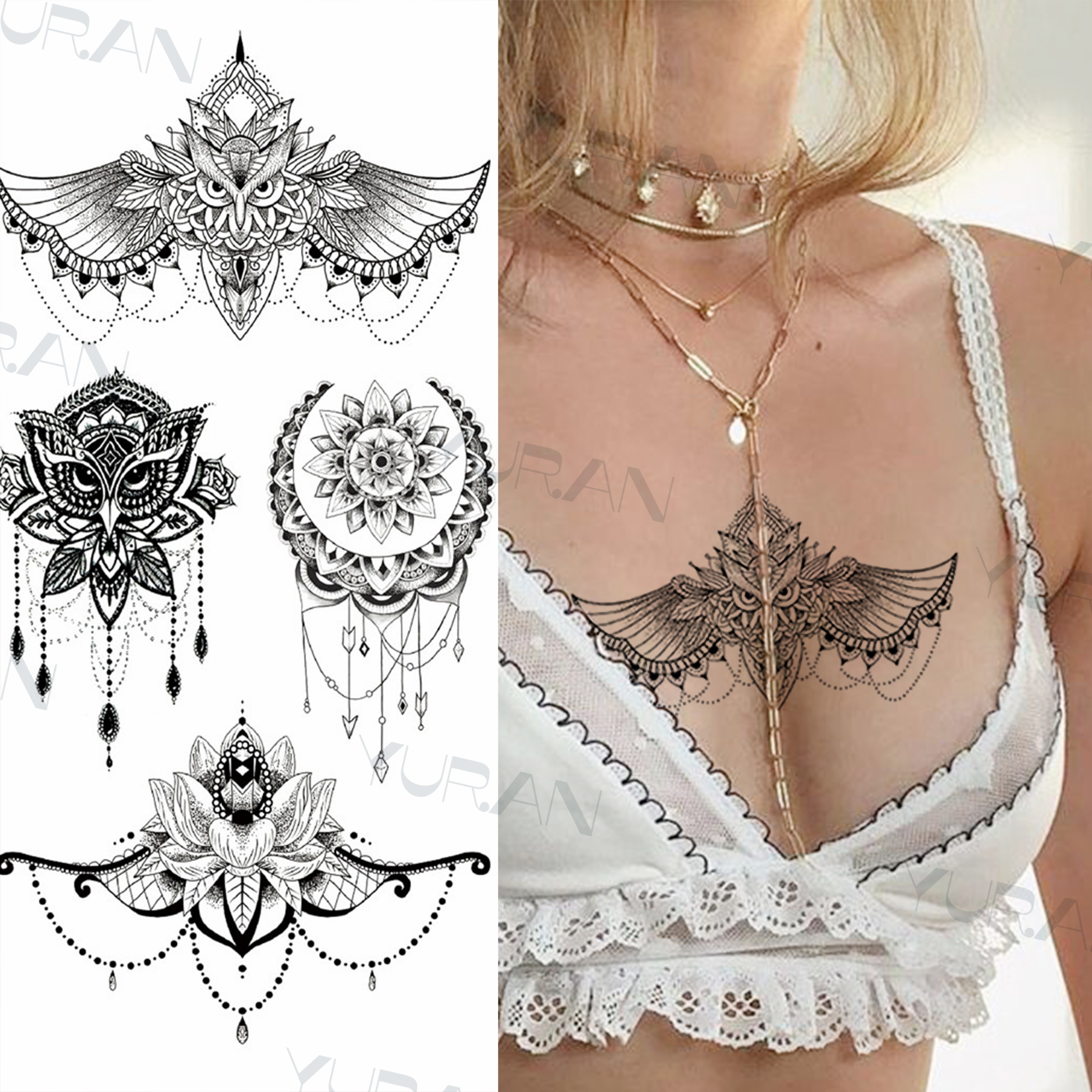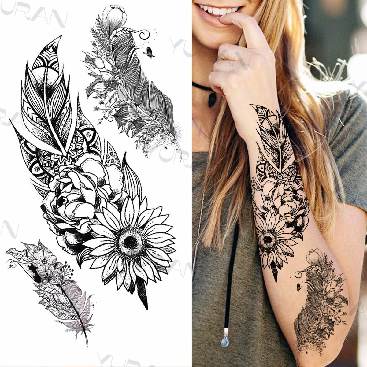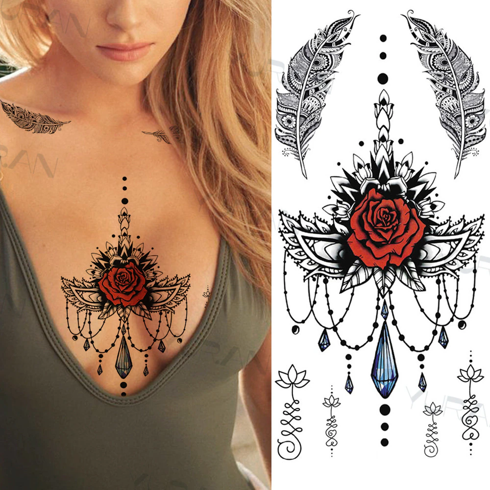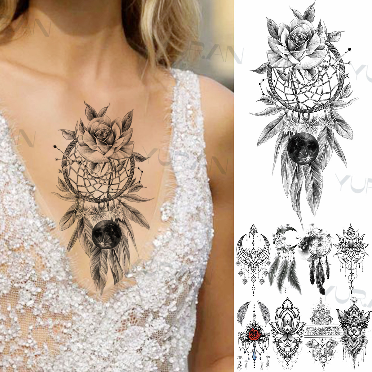 Sdrawing Catcher Rose Flower Temporary Tattoos For Women Adult Henna Moon Feather Owl Fake Tatoos Realistic Sexy Chest Tattoo Paste