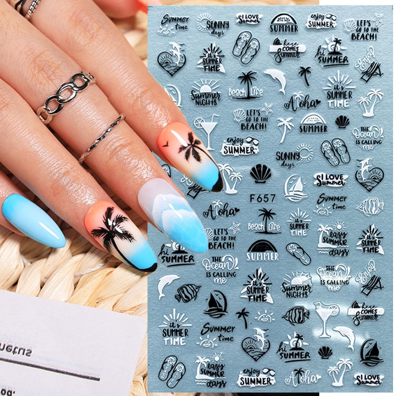1 Pc 3D Flower Tropical Plants Summer Nail Sticker Black Gold Leaves Nail Adhesive Transfer Decals DIY Nail Art Decoration