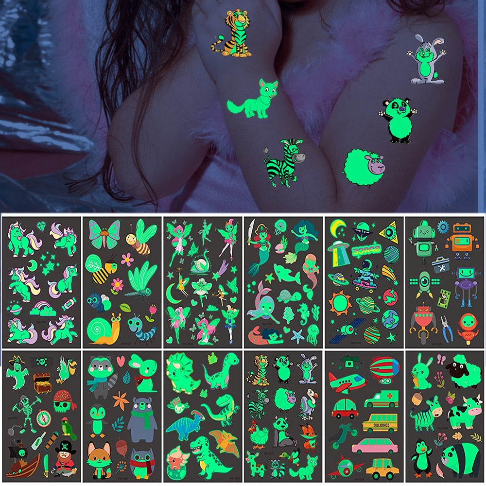 10pcs/Lot Luminous Night Children Temporary Fake Tattoos Dark In Glow Animal Cartoon Car Fairy Mermaid Space Tiger Kids Sticker