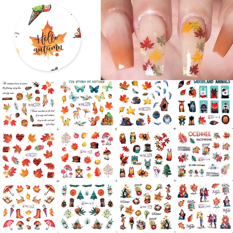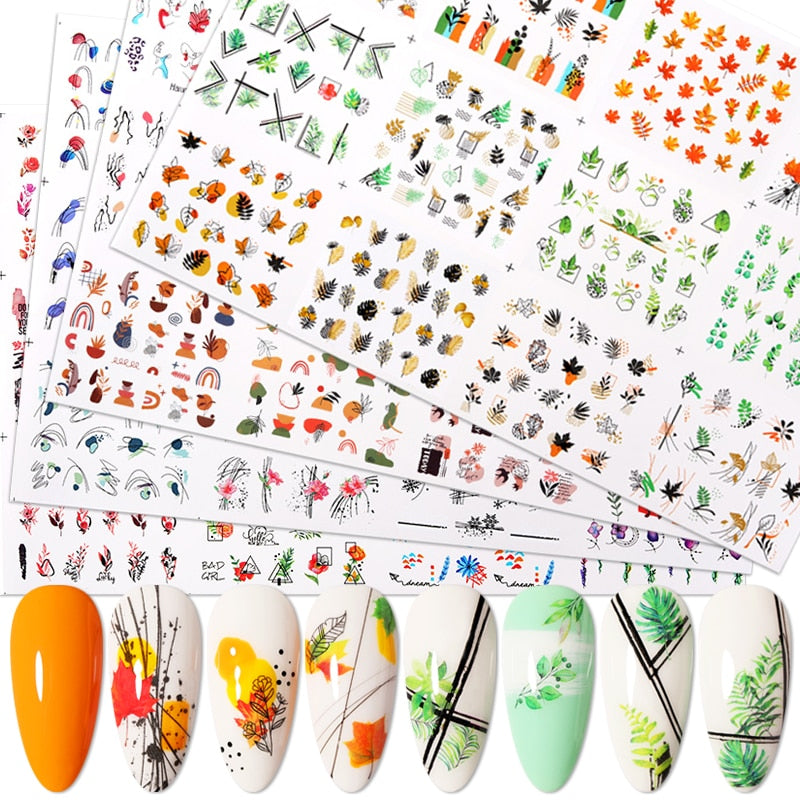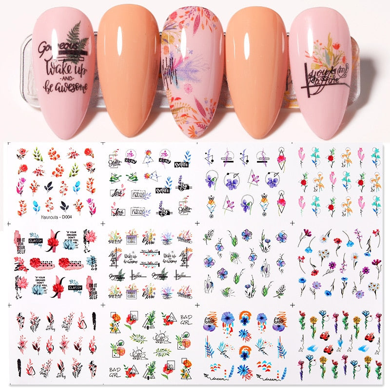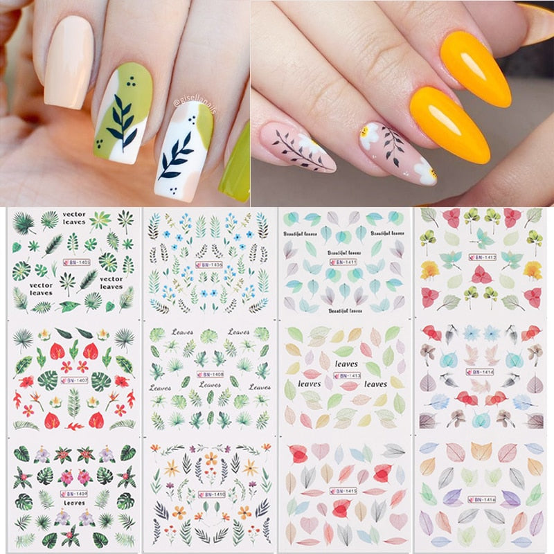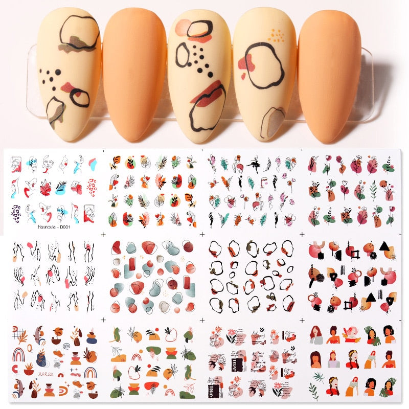 12Designs Simple Green Leaves Flower Nail Water Decals Harunouta Geometric Lines Watermarks Stickers Decoration Manicures