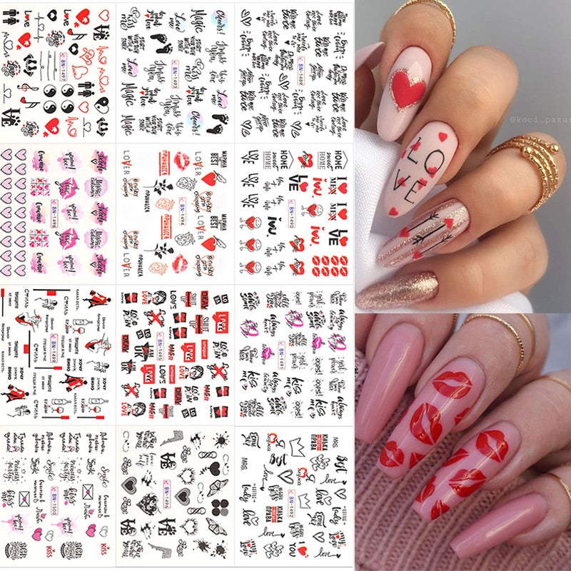 12Pcs/Set Heart Shaped Lips Designs Water Decals English Love Letter Stickers For Nails Nail Art Decoration Sliders Manicure DIY