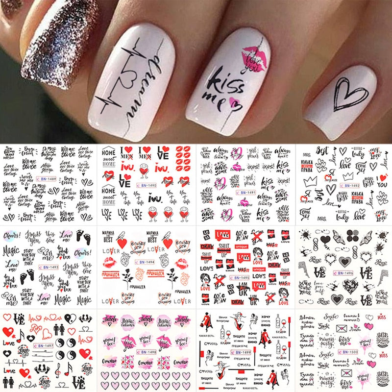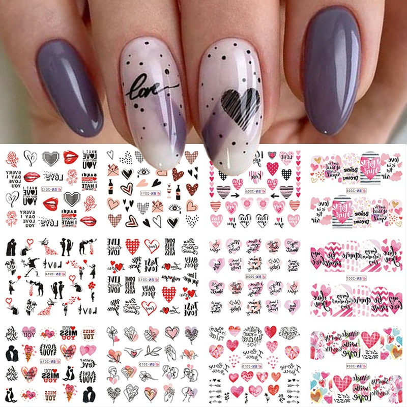 12pcs Valentines Manicures Love Letter Flower Transfer Stickers For Nails Inscriptions Nail Art Decoration Water Sliders Tips