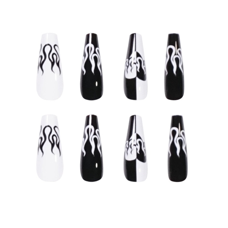24pcs Press on Nails Punk Black White Patchwork Fire Pattern Long Coffin False Nails Ballerina Fake Nail Art Manicure Full Tips