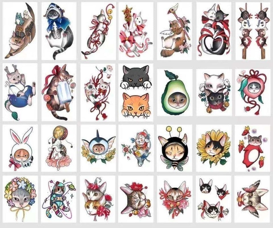 30PCS Cute Cartoon Cat Temporary Tattoos Waterproof Flash Decals Arm Wrist Body Art Fake Tatto Stickers Tatoos Animal Stickers