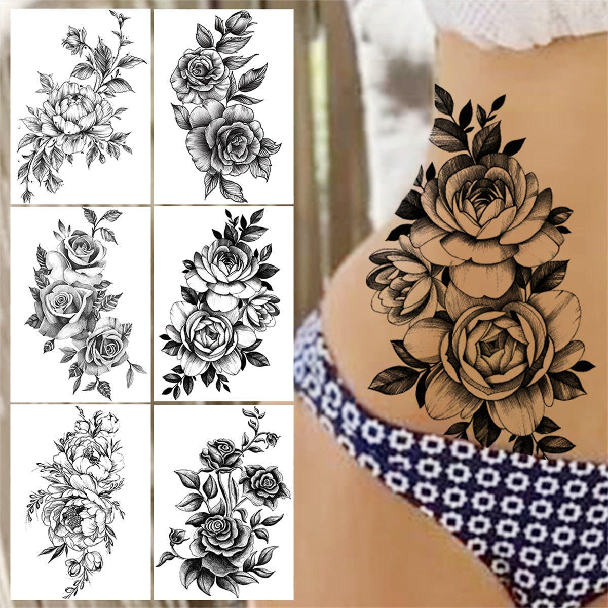 3D Blossom Peony Temporary Tattoos For Women Girls Fake Flower Tattoo Sticker Anemone Zinna Black Floral Sexy Tatoo Transferable
