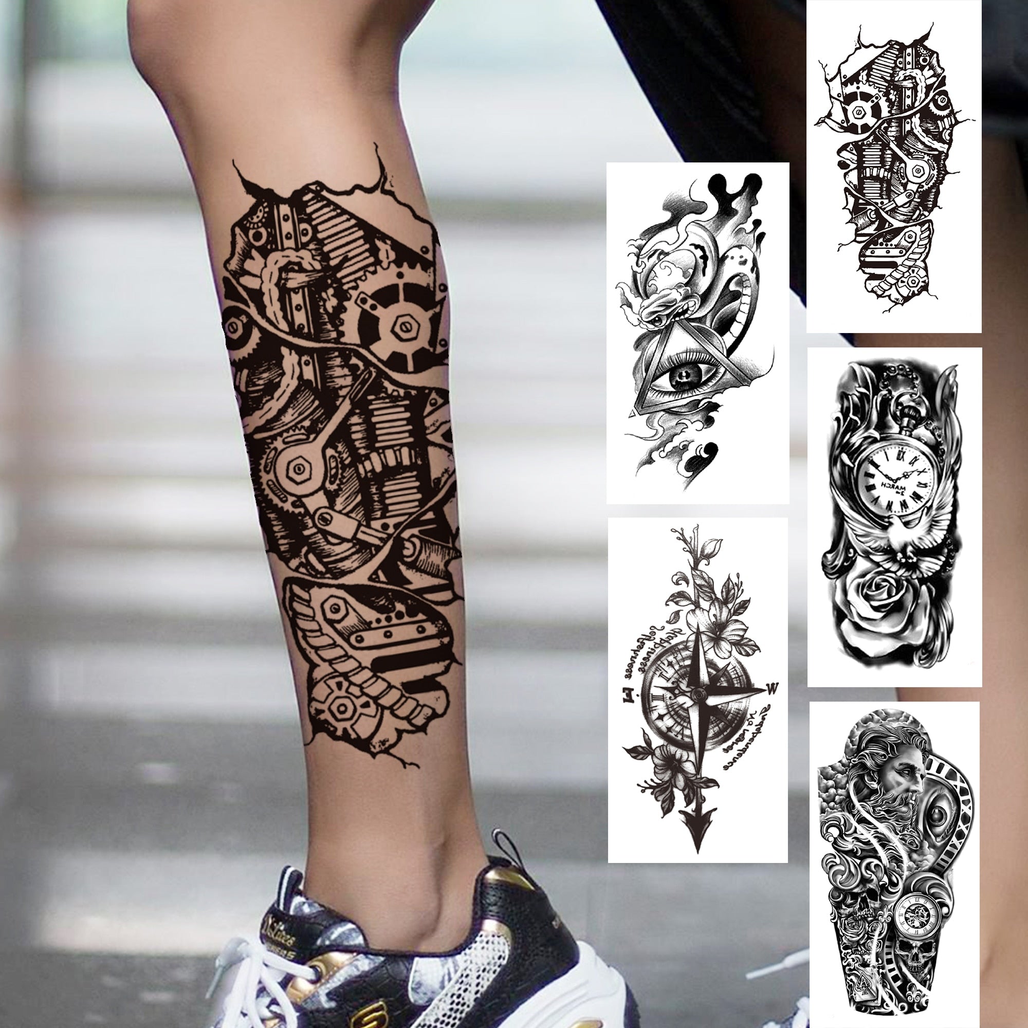 3D Machinery Temporary Tattoos For Women Men Adult Black Flower Compass Tattoo Sticker Fake Triangle Eye Clock Tatoos Leg Body