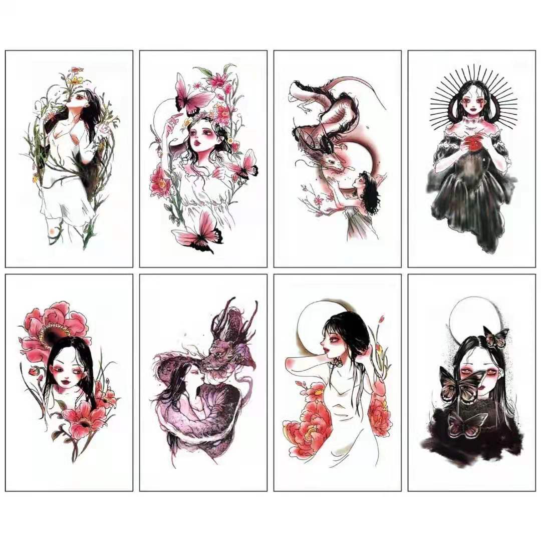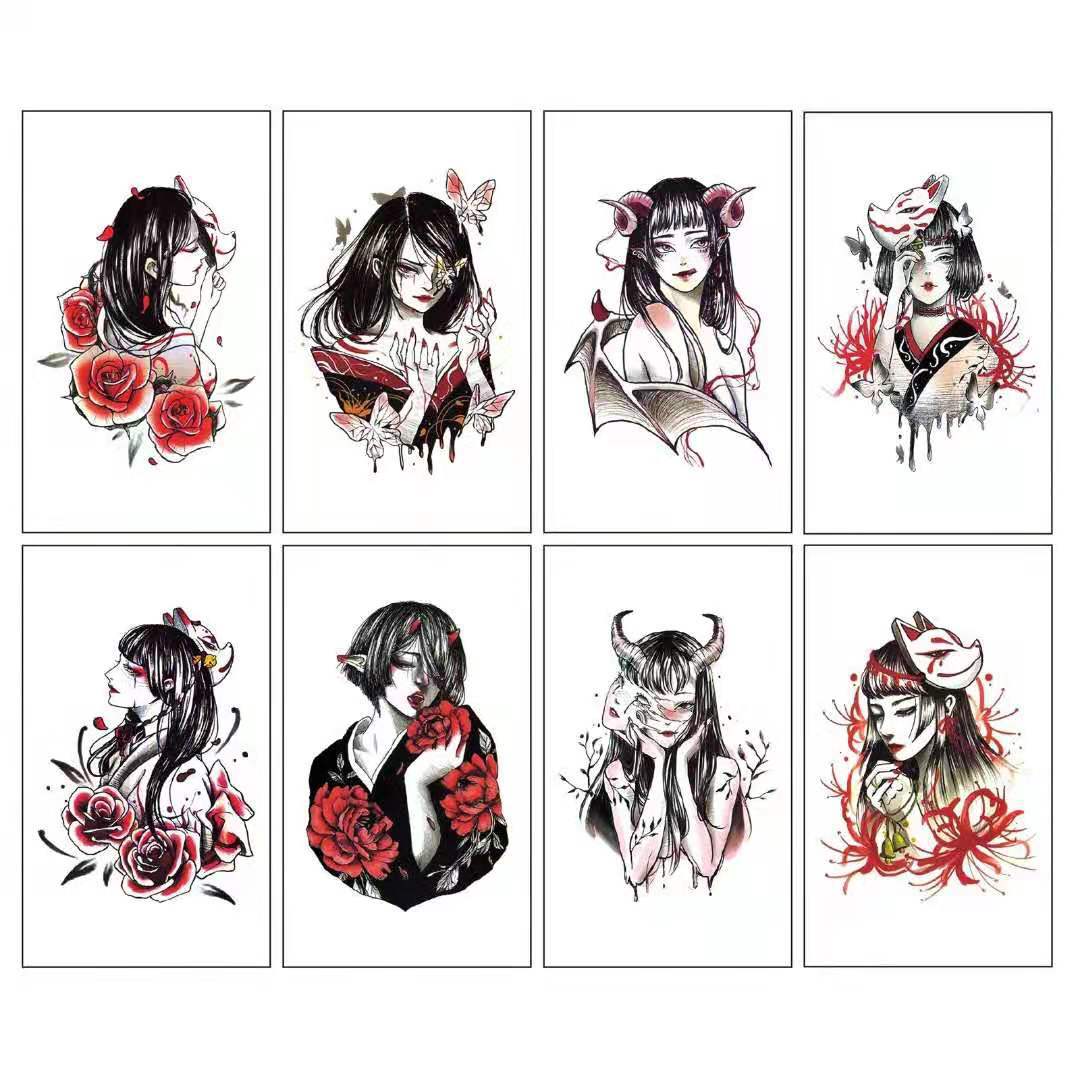 8pcs Temporary Tattoo Devil Mask Japanese Geisha Ukiyo-e Gril Body Art Water Transfer Fake Tatoo Flash Tatto Sticker Men Women