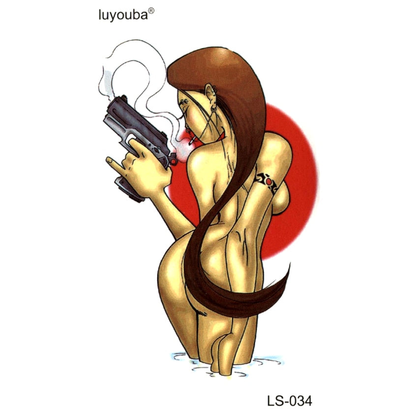 A woman with a pistol waterproof temporary tattoos men harajuku flash tattoo sticker Killer tatoo sleeves fake tatto