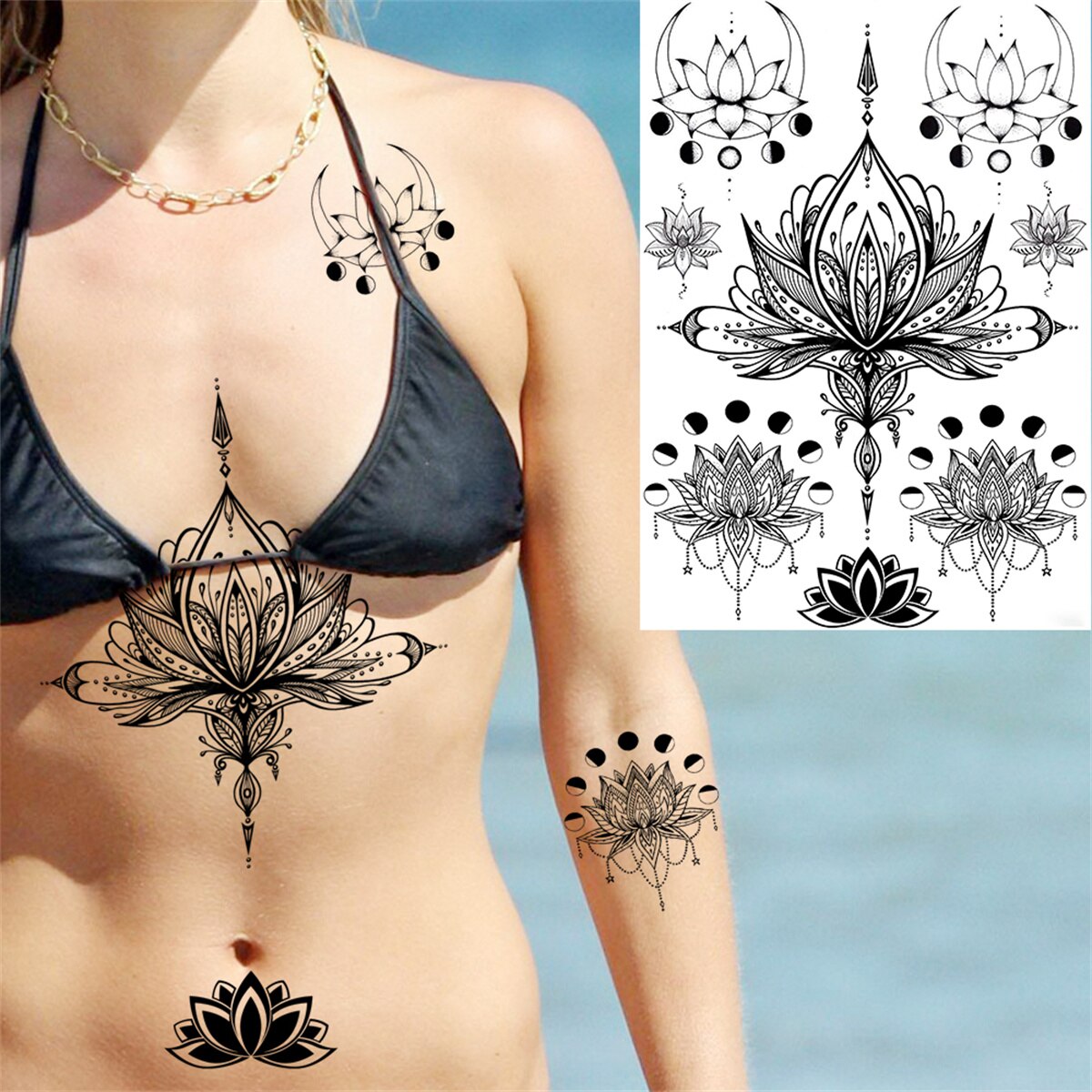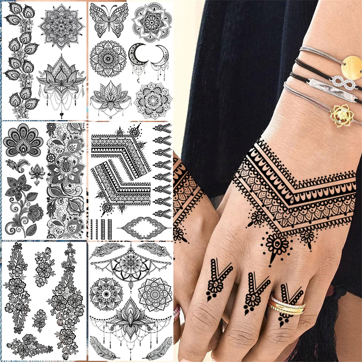 Black Henna Lace Temporary Tattoos For Women Girl Adult Mandala Flower Tattoo Sticker Fake Lotus Butterfly Tatoos Hand Foot Feet