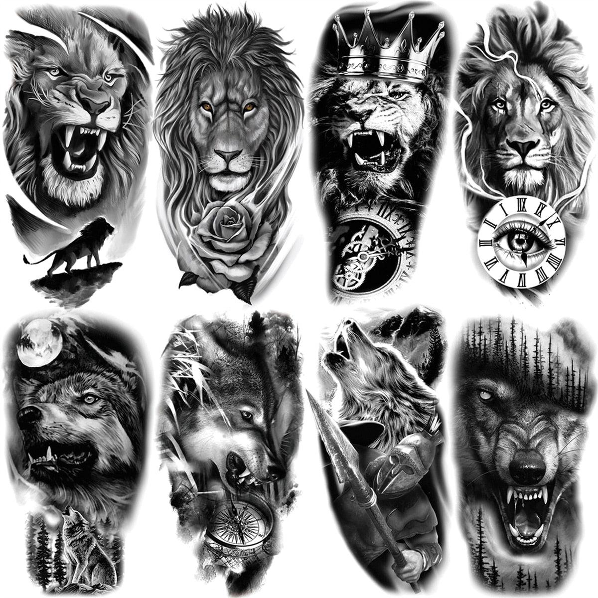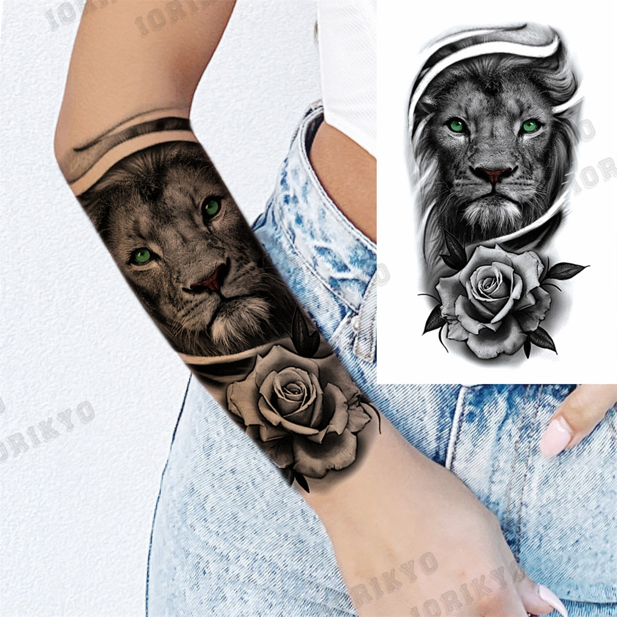 Black Lion Wolf Temporary Tattoos For Men Adult Forest Rose Compass Warrior Fake Tattoo Washable Body Art Painting Tatoo Sticker