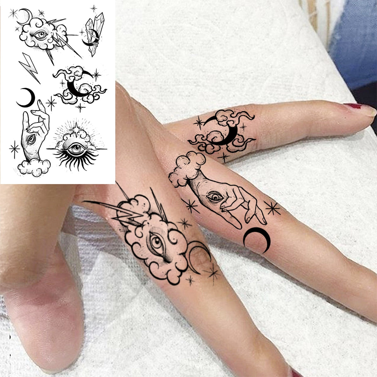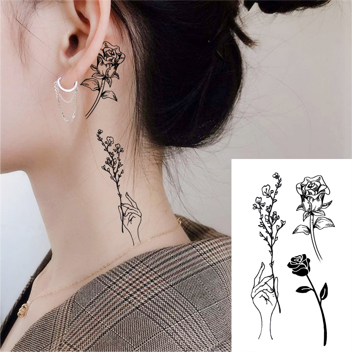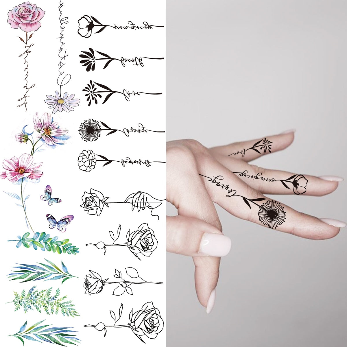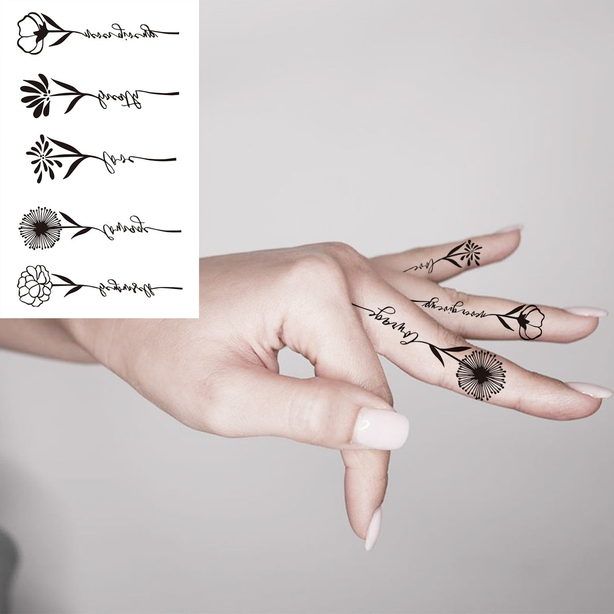 Black Little Flower Fashion Finger Temporary Tattoos For Women Adult Leaves Daisy Rose Fake Tattoo Letter Body Art Tatoos Decal