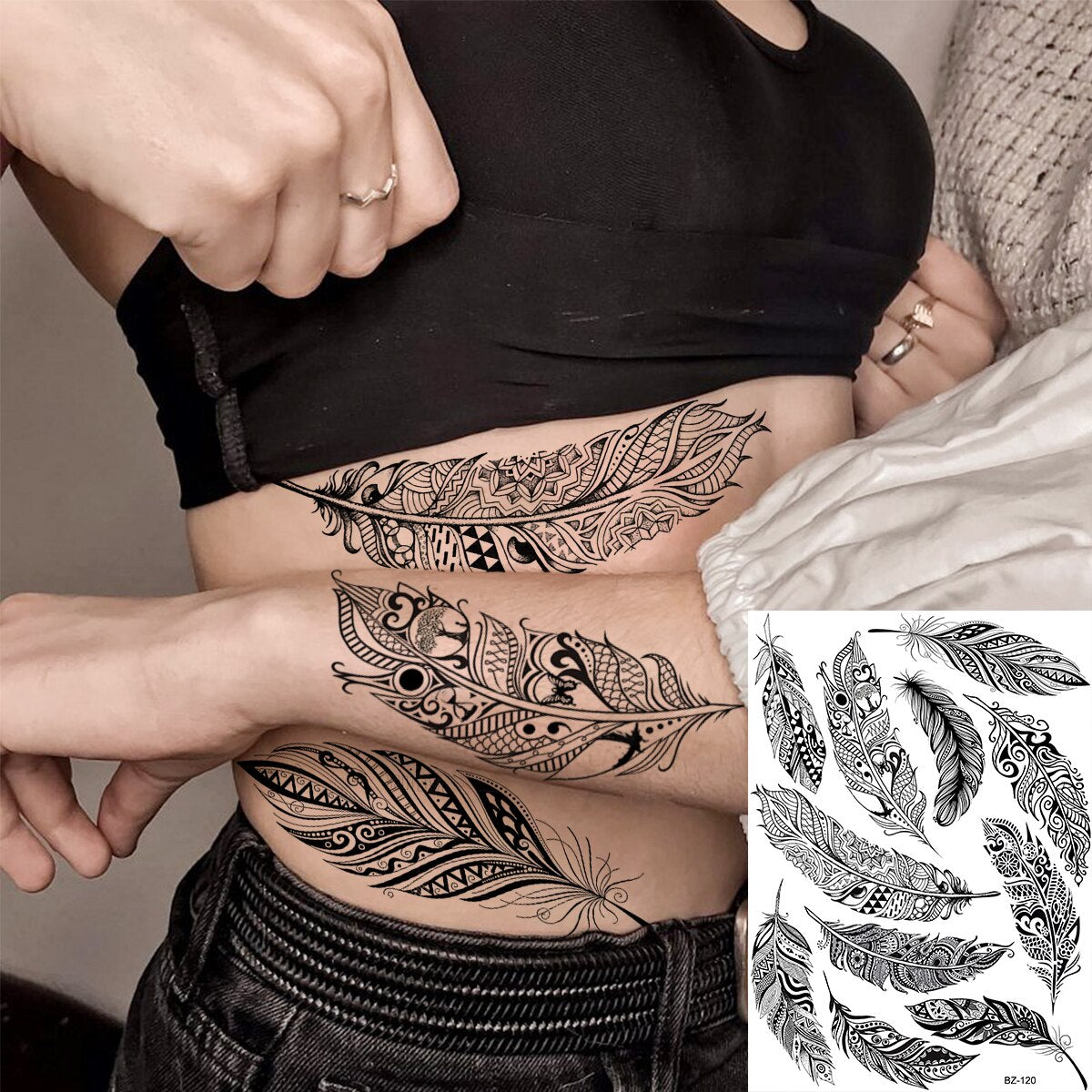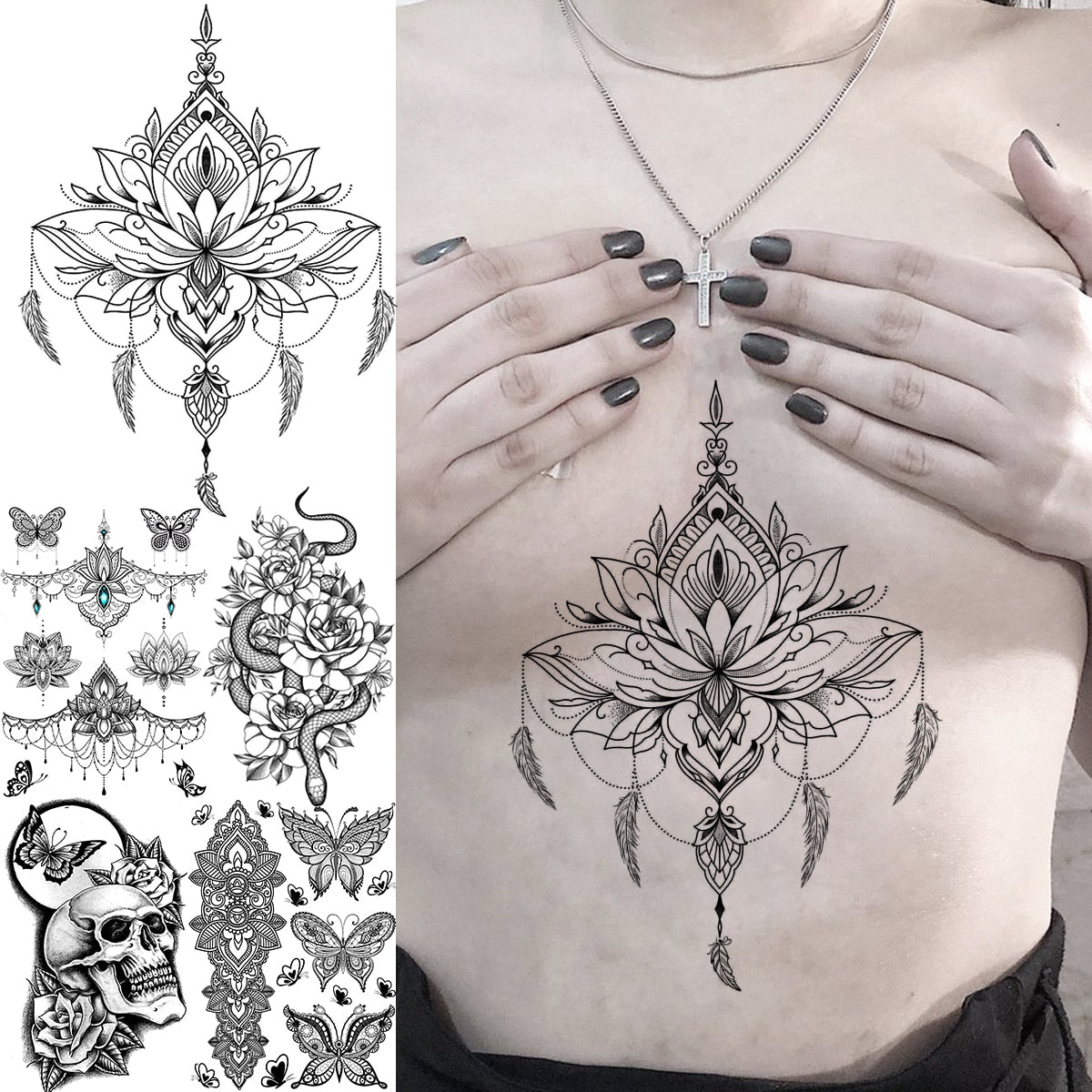 Black Lotus Pendant Underboob Temporary Tattoos For Women Adult Mandala Butterfly Snake Skull Fake Body Art Tatoos Paper