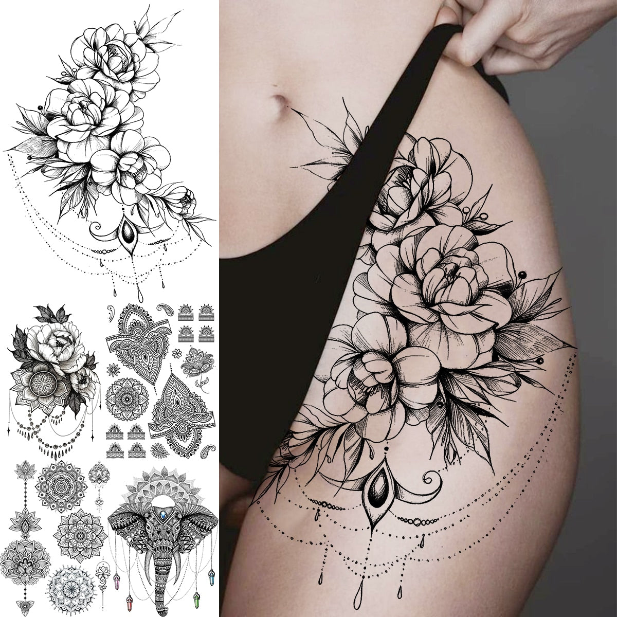 Black Peony flower pendant Temporary Tattoos For Women Adult Mandala Thigh elephant Fake Tattoo Sexy washable tatoos decal