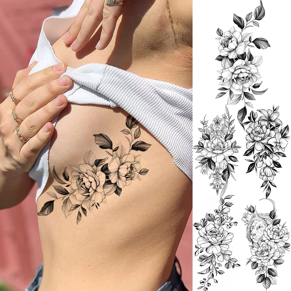 Black Peony Flower Sexy Boobs Temporary Tattoos For Women Adult Girl Rose Lion Moon Fake Tattoo Realistic Body Art Tatoos Paper