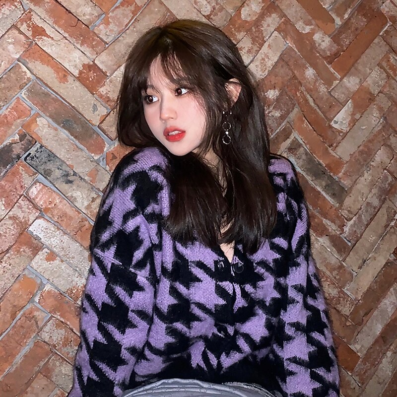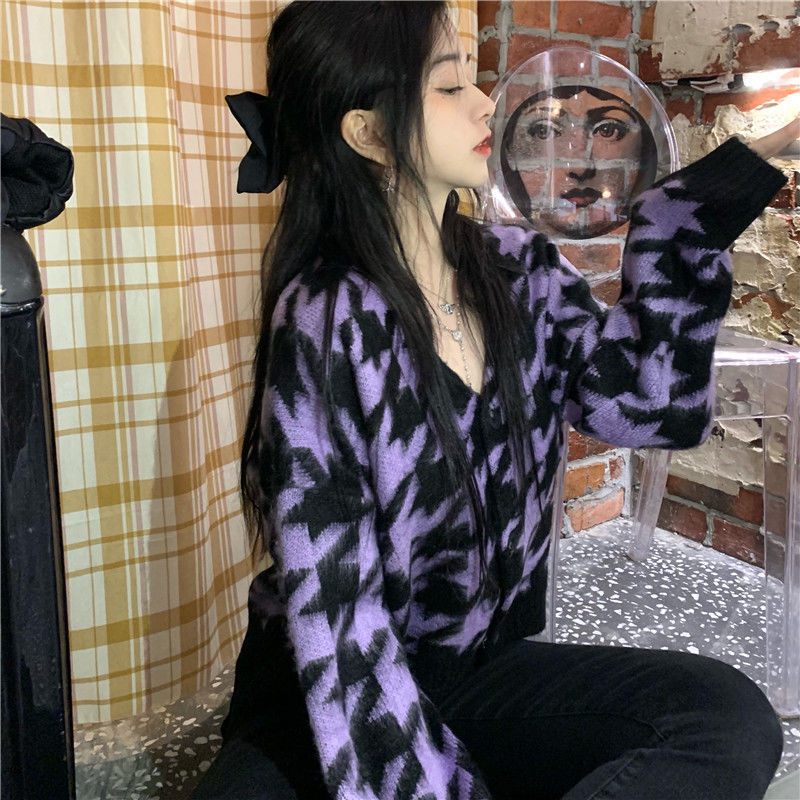 Cardigan Women Houndstooth Y2k Vintage Elegant V-neck Girls All-match Sweater Outerwear Korean Fashionable Loose Warm Sweet Teen