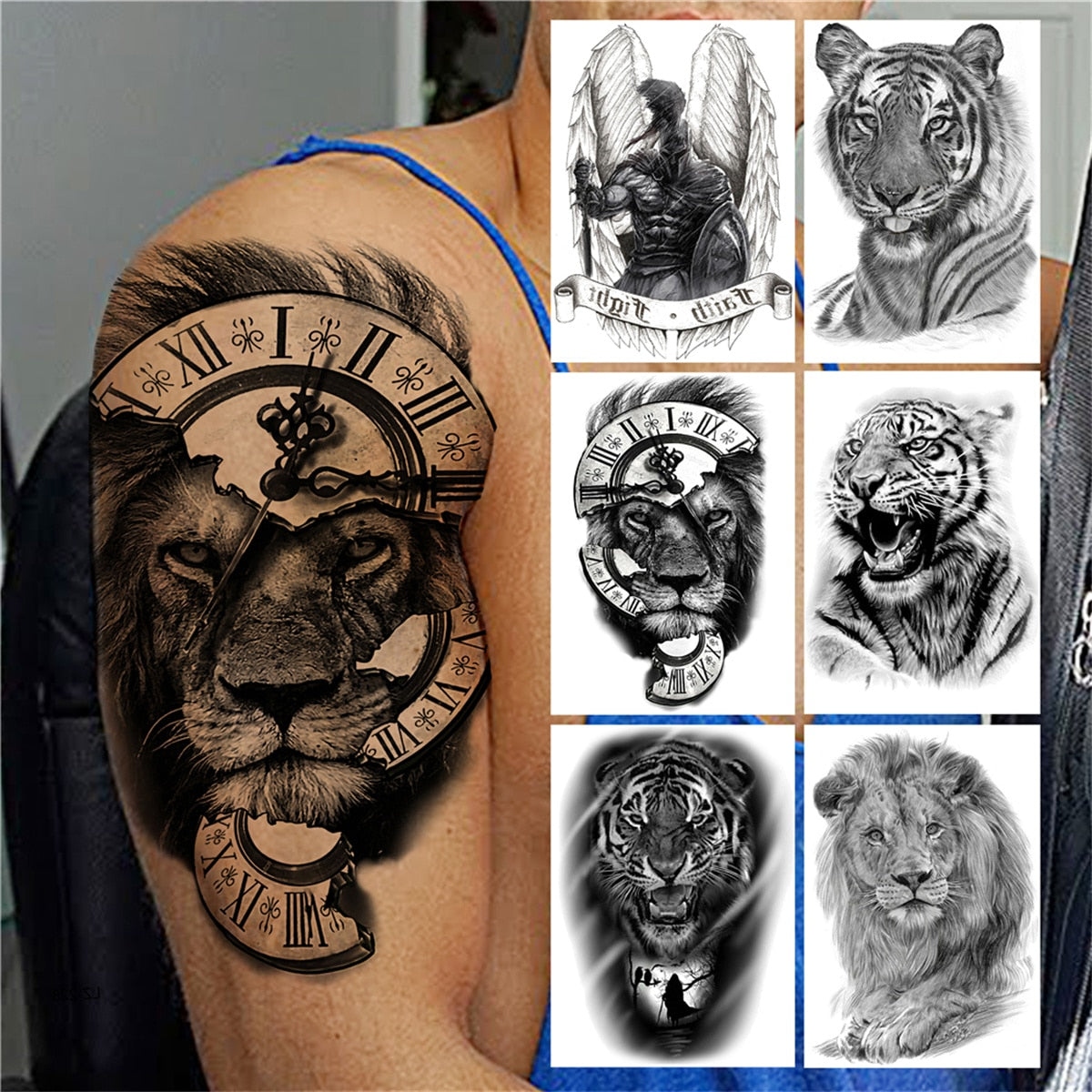 Compass Lion Temporary Tattoo For Men Women Kids Boys Girls Tiger Animal Tattoo Sticker Black Fake Warrior Wings Tatoos Paper