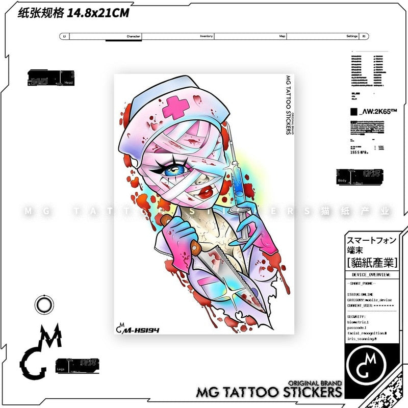 Dark Anime Nurse Girl Alternative Tattoo Stickers Waterproof Men and Women Tide Tattoo Stickers