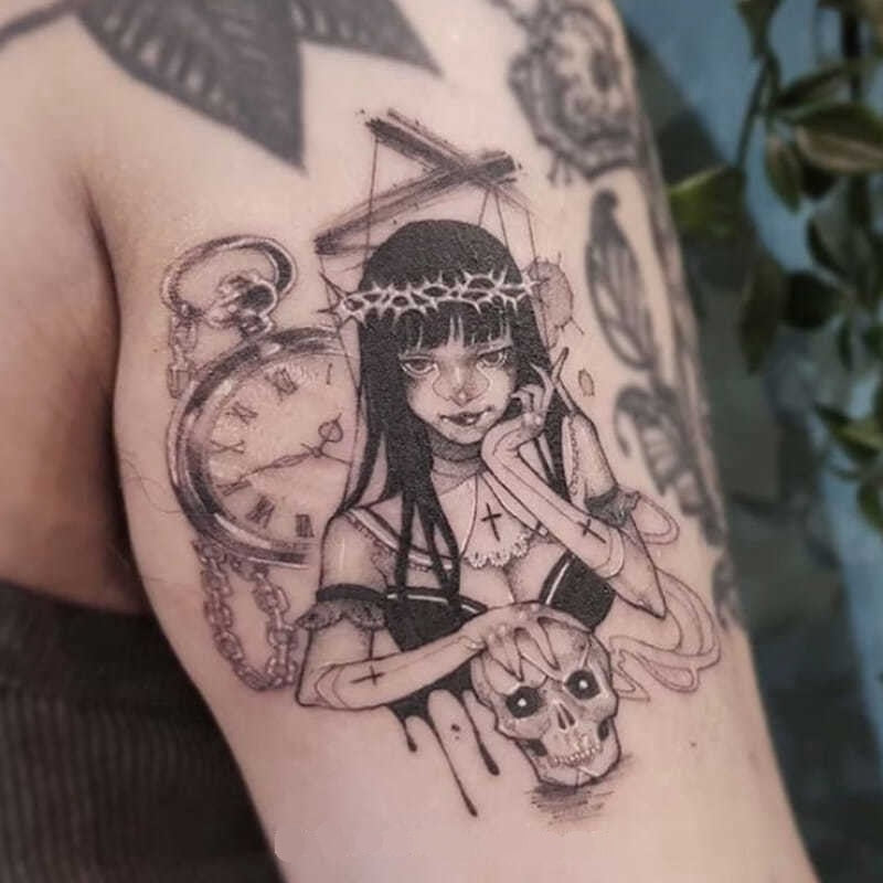 Dark Puppet Witch Waterproof Temporary Tattoo Stickers Female Skull Shackles Horror Art Fake Tattoos Flower Arm Tattoo Stickers