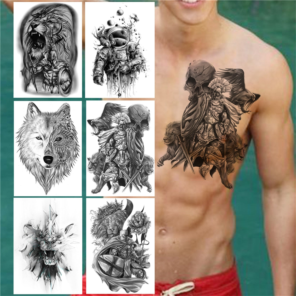 Demon Warrior Temporary Tattoos For Men Women Adult Kids Realistic Fake Wolf Lion Tattoo Sticker Black Astronaut Tatoos Large