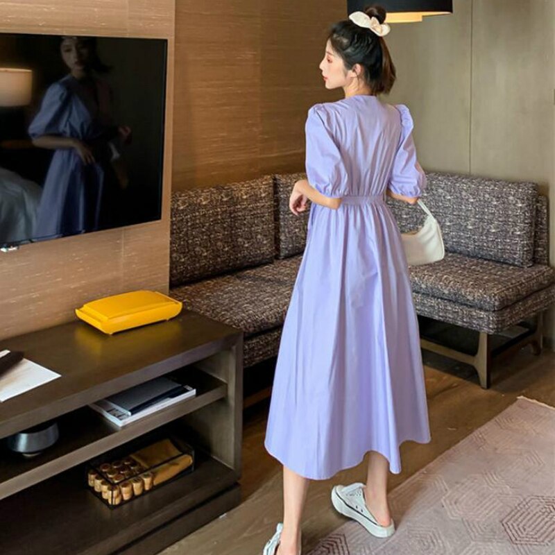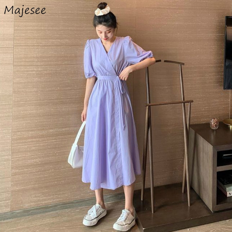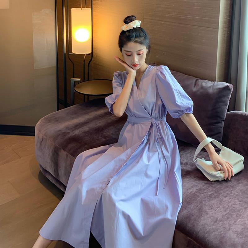 Dresses Sexy Women Summer Purple White V-Neck Solid Lace Up Waist Down Robe Female Puff Sleeve French Style Girls Sweet Popular