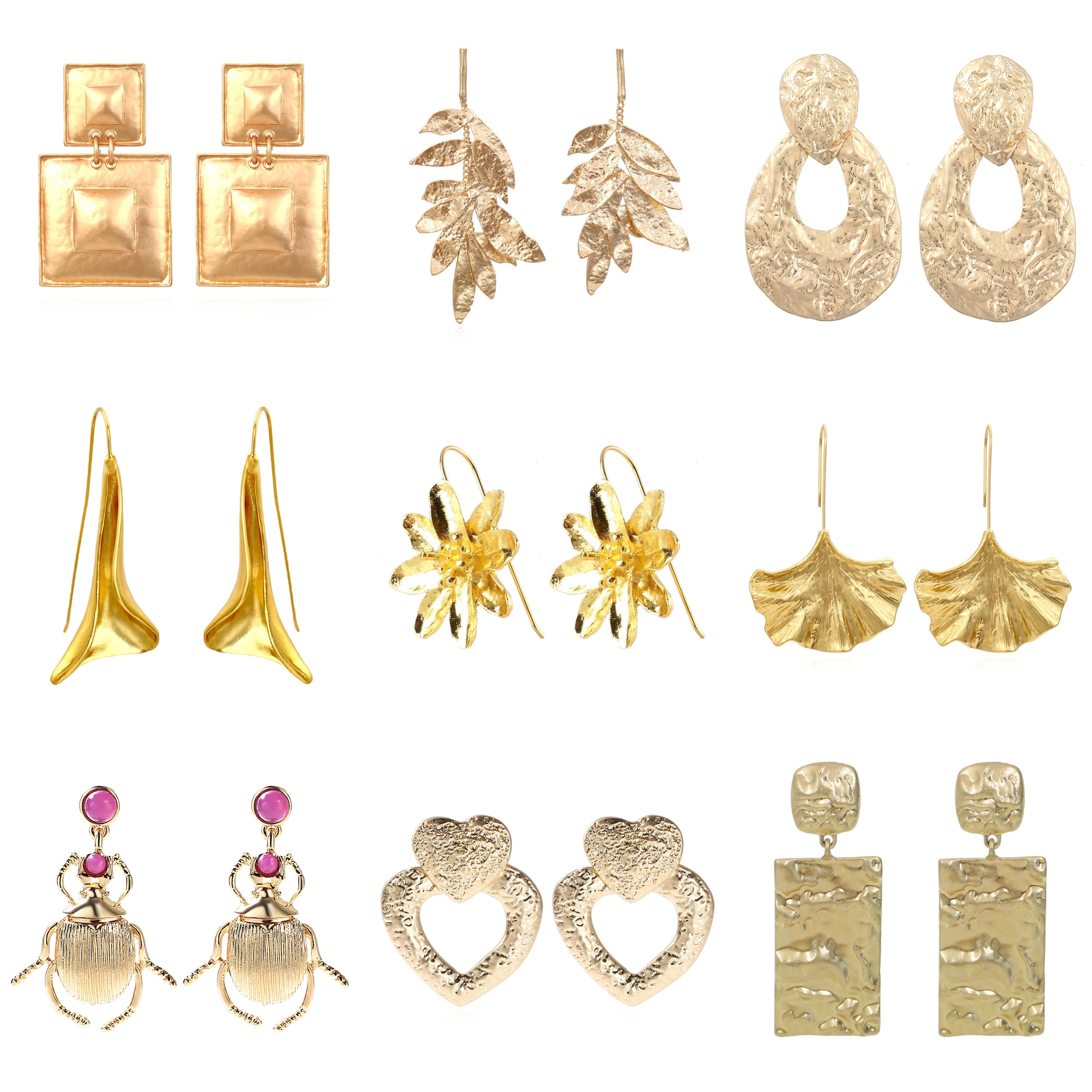 Dvacaman Golden Leaf Flower Earrings For Women Vintage Irregular Geometric Metal Long Drop Dangle Beetle Earrings Trendy Jewelry