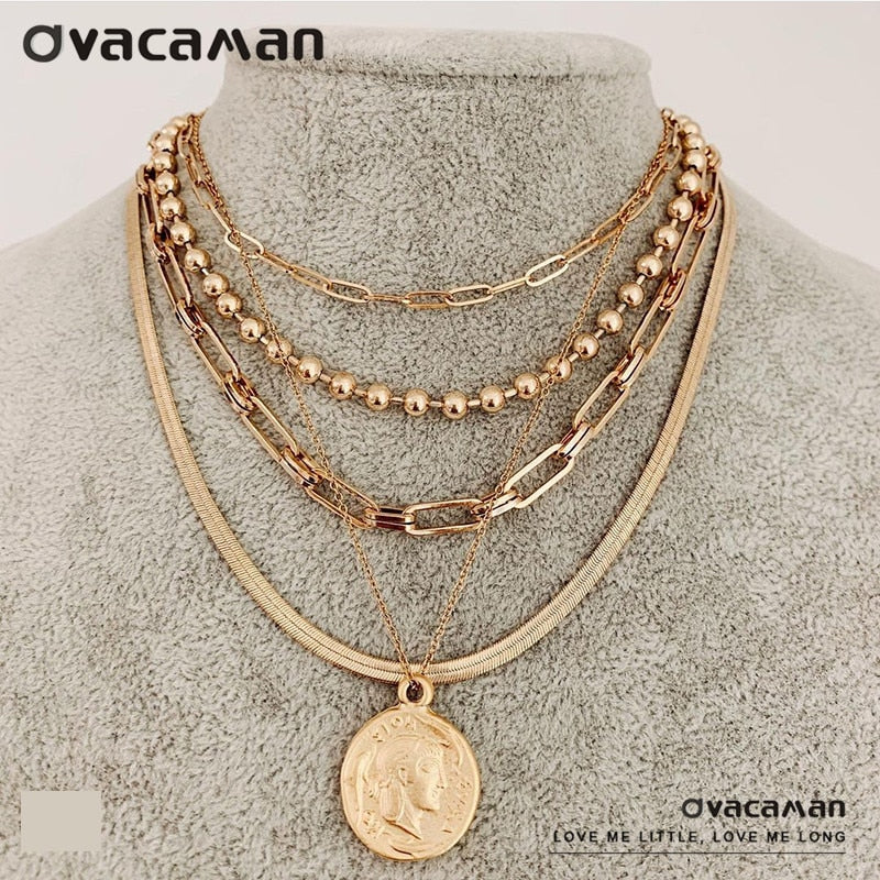 Dvacaman New Punk Gold Color Portrait Pendant Necklace for Women Cuban Multi Layered Chunky Thick Chain Choker Necklaces Jewelry