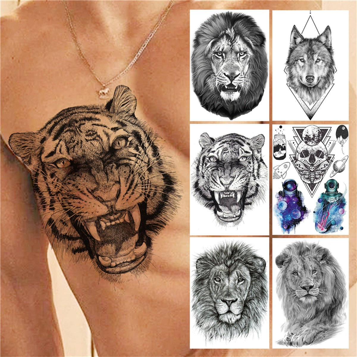 Evil Tiger Temporary Tattoos For Men Women Adult Boys Geometry Wolf Tattoo Sticker Animal Fake Lion Black Skull Astronaut Tatoo