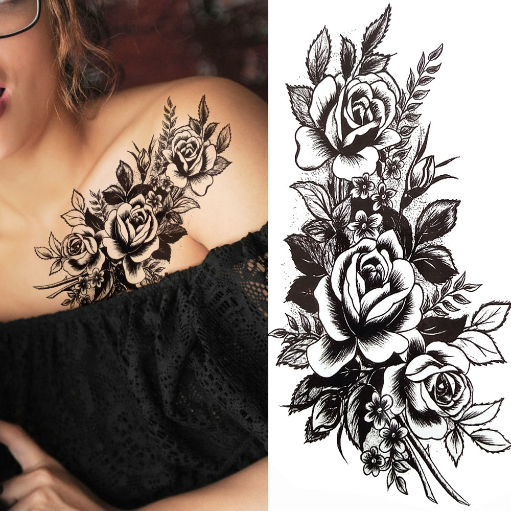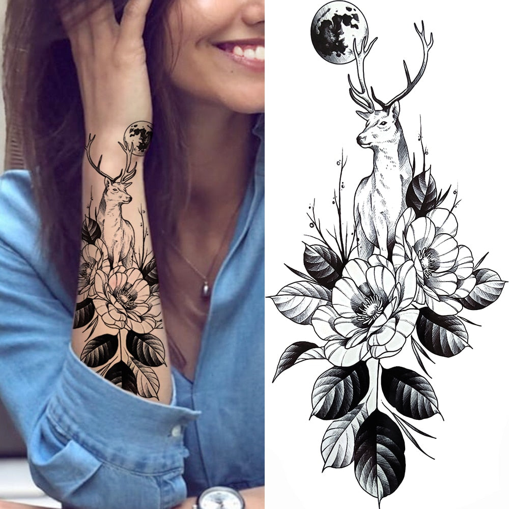 Fake Flower Rose Temporary Tattoos For Women Girl Peony Daisy Deer Moon Tattoos Sticker Black Cluster Body Art Painting Tatoos