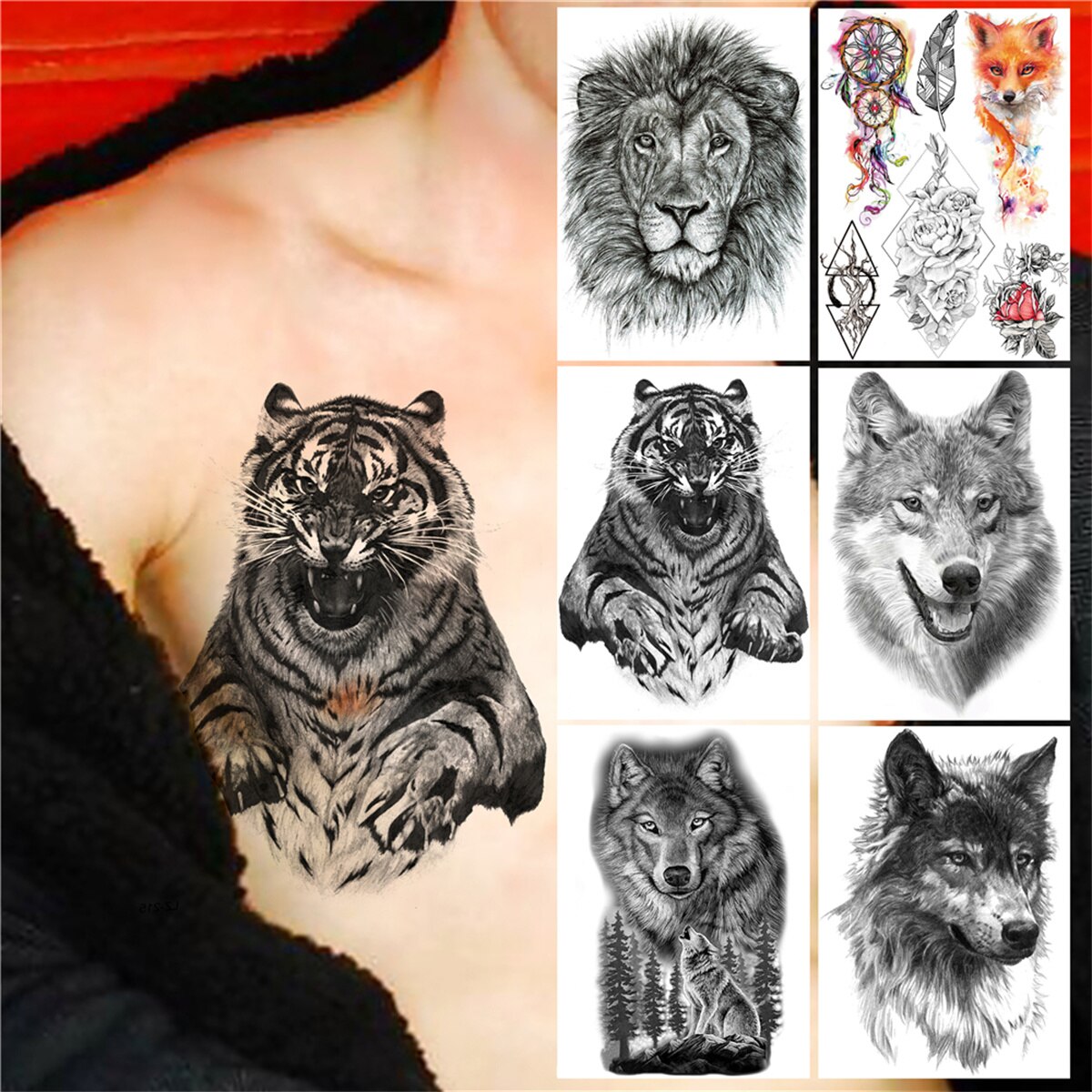 Ferocious Demon Tiger Temporary Tattoos For Men Women Adult Fake Lion Wolf Tattoo Sticker Black Animals Coyote Fox Tatoos Paper