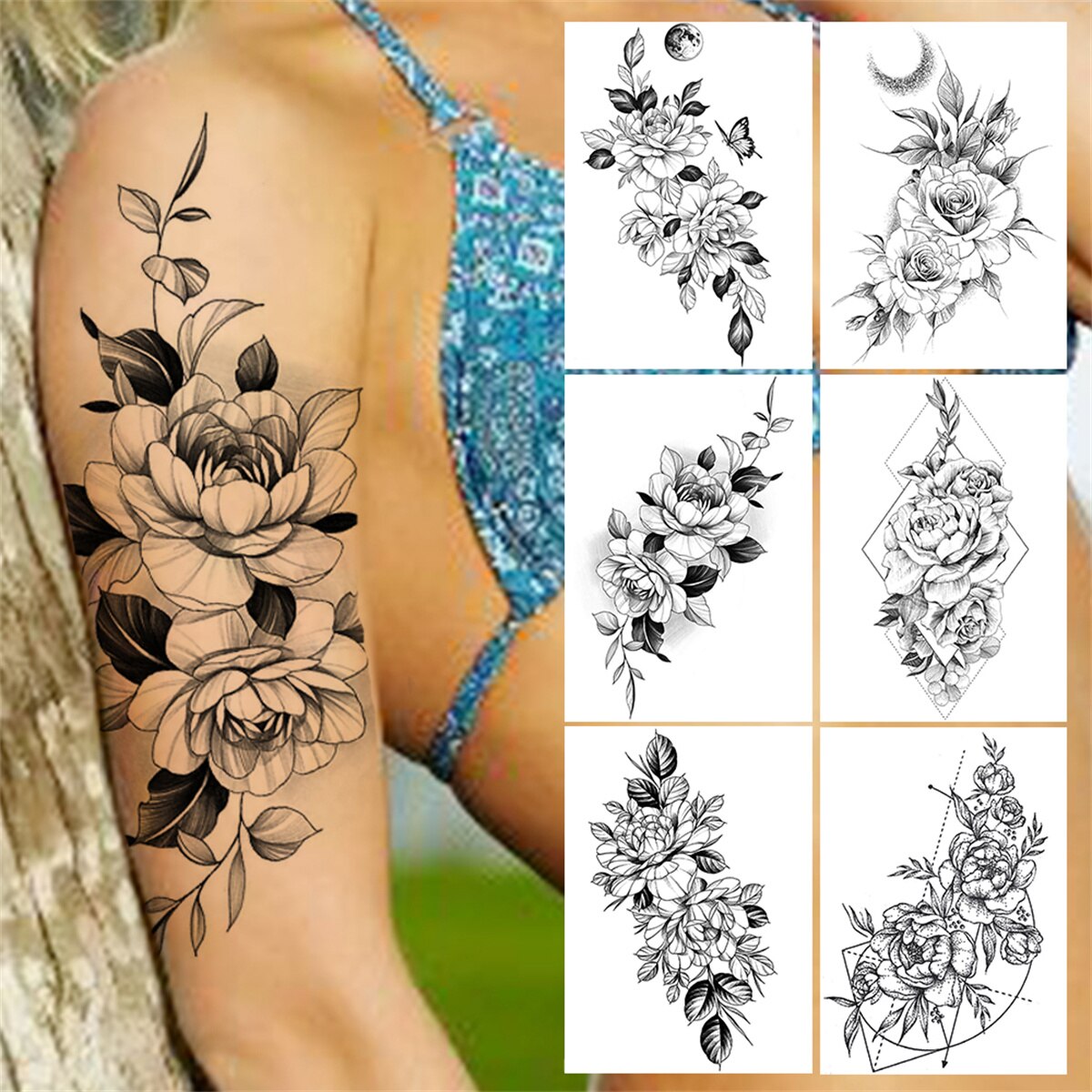 Flower Temporary Tattoos For Women Adult Girls Rose Geometry Tattoos Sticker Fake Moon Peony Large Black Floral Tatoos Supplies