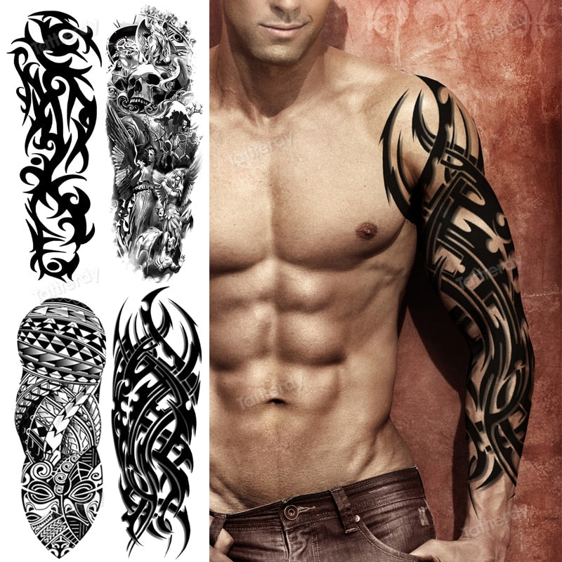 full arm temporary tattoos large black totem trial boys tatoo fake waterproof skull lion sleeve tattoo stickers body art makeup