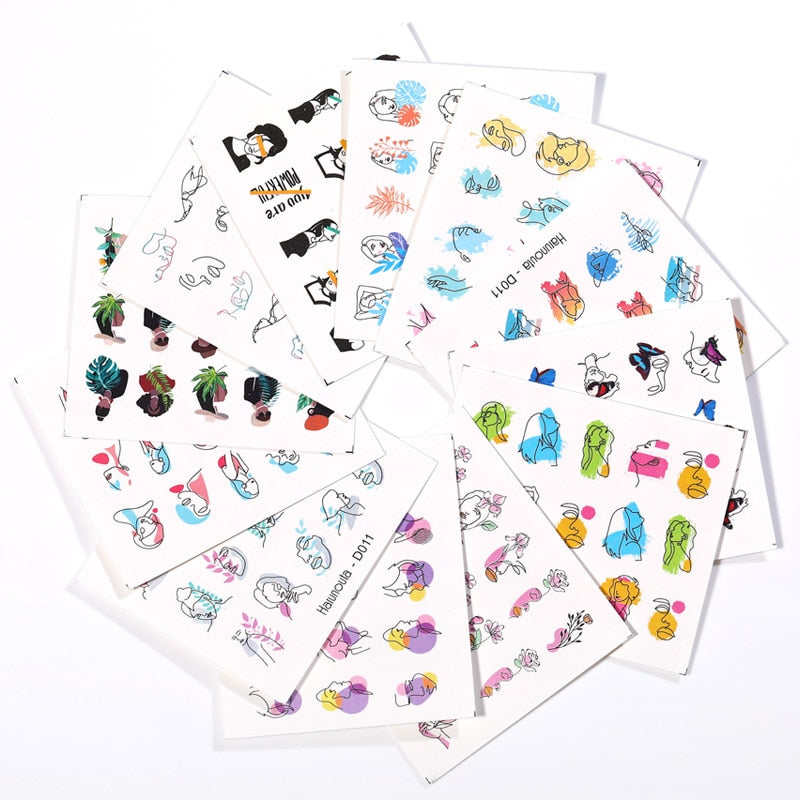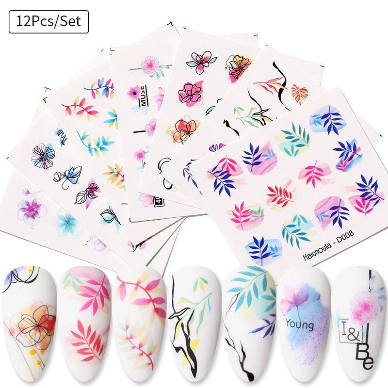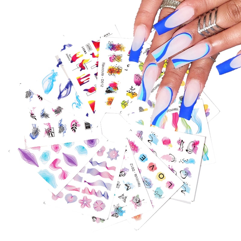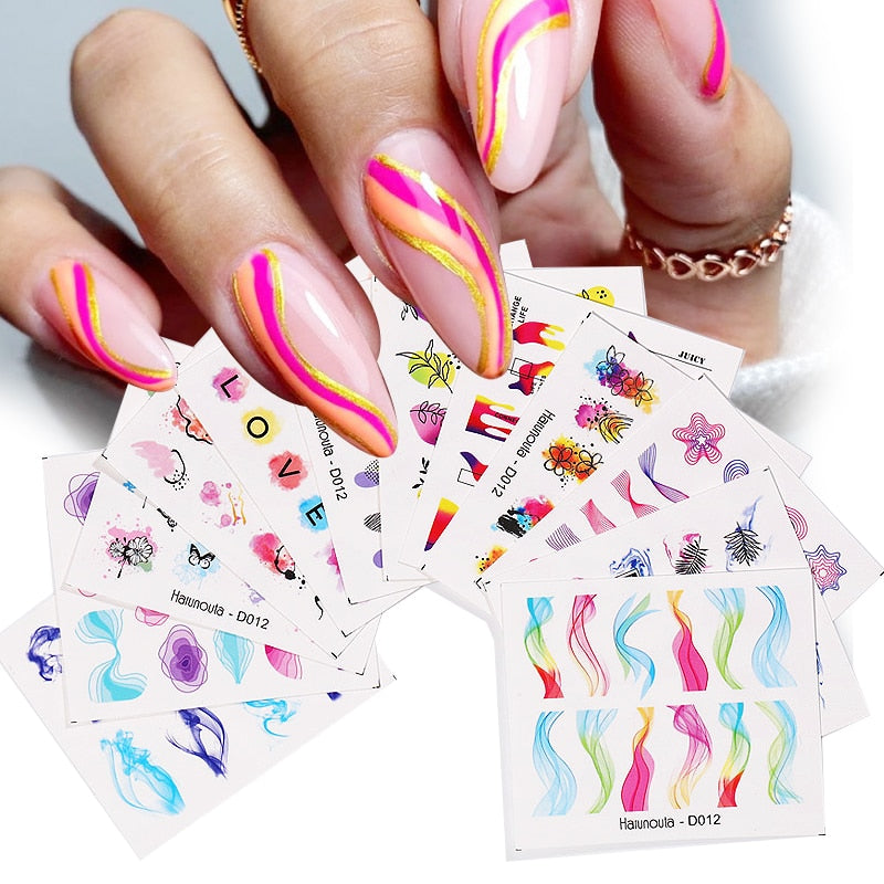 Harunouta 12Pcs Gradient Geometry Line Water Decals Set Pink Blue Colorful Whirlpool Wave Stickers Sliders Nail Art Decorations