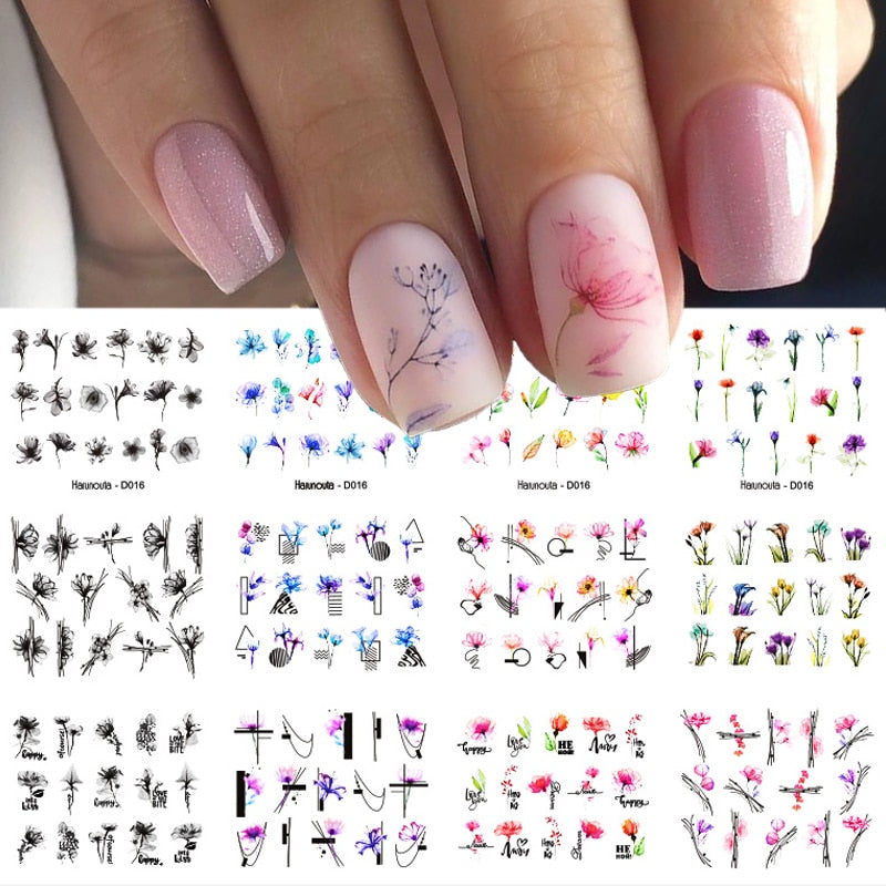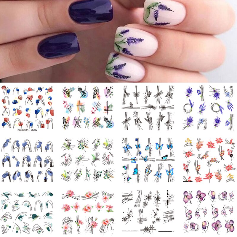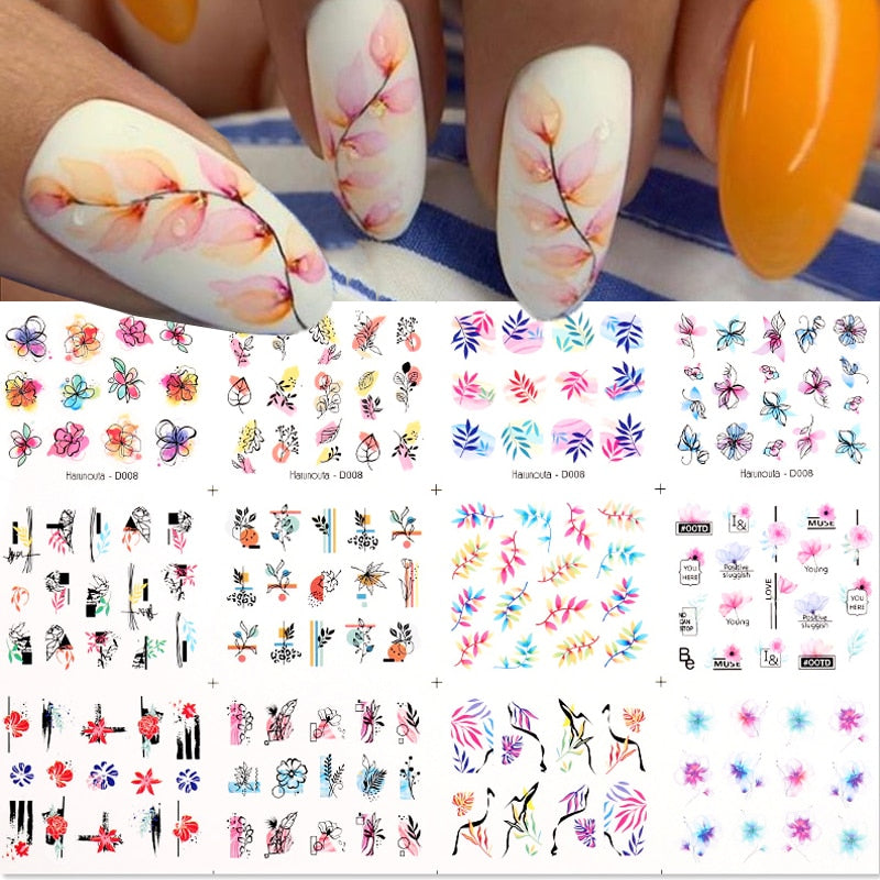Harunouta 12pcs Simple Green Theme Water Decal Sticker Flower Leaf Tree Summer DIY Slider For Manicuring Nail Art Watermarks
