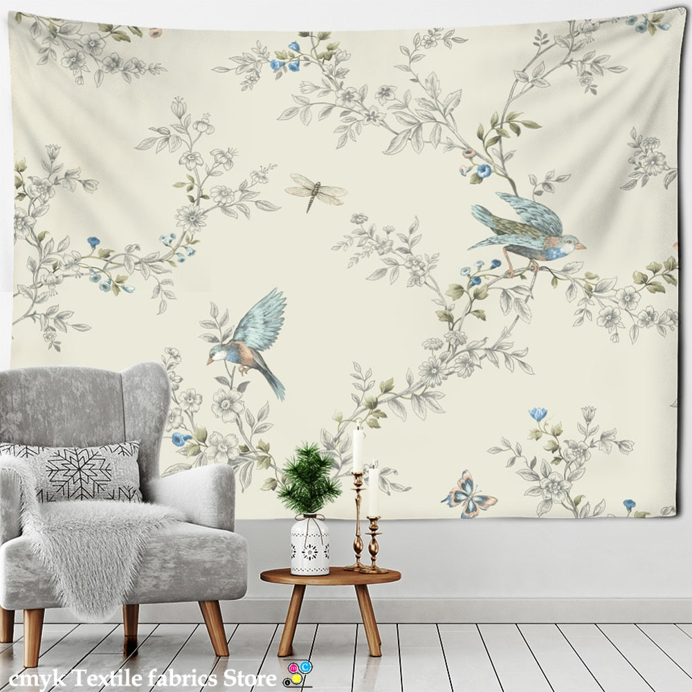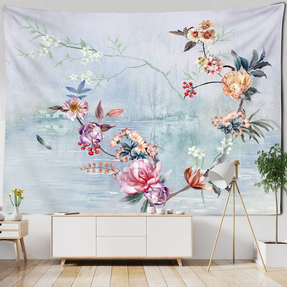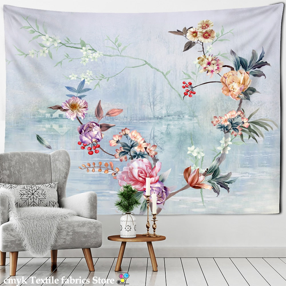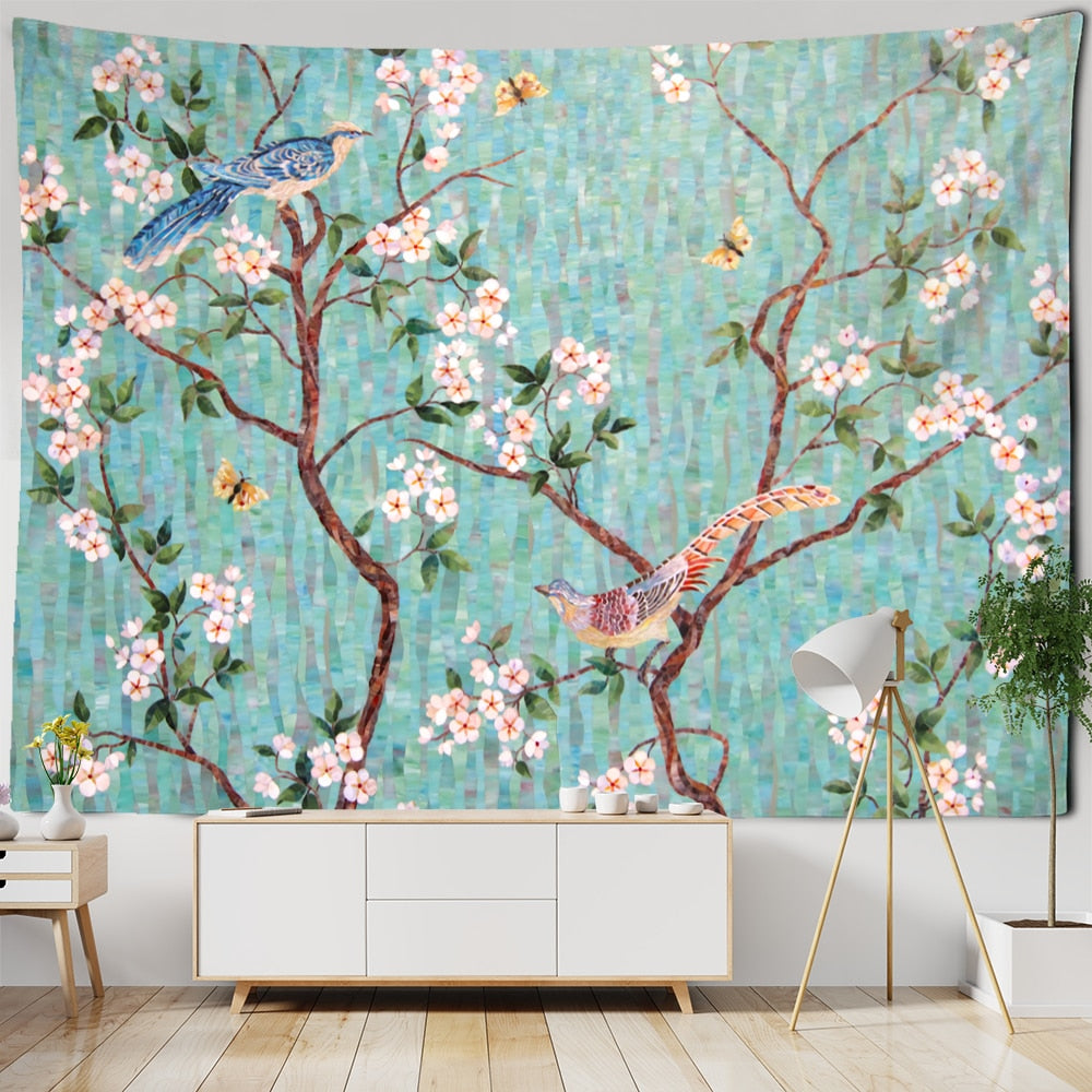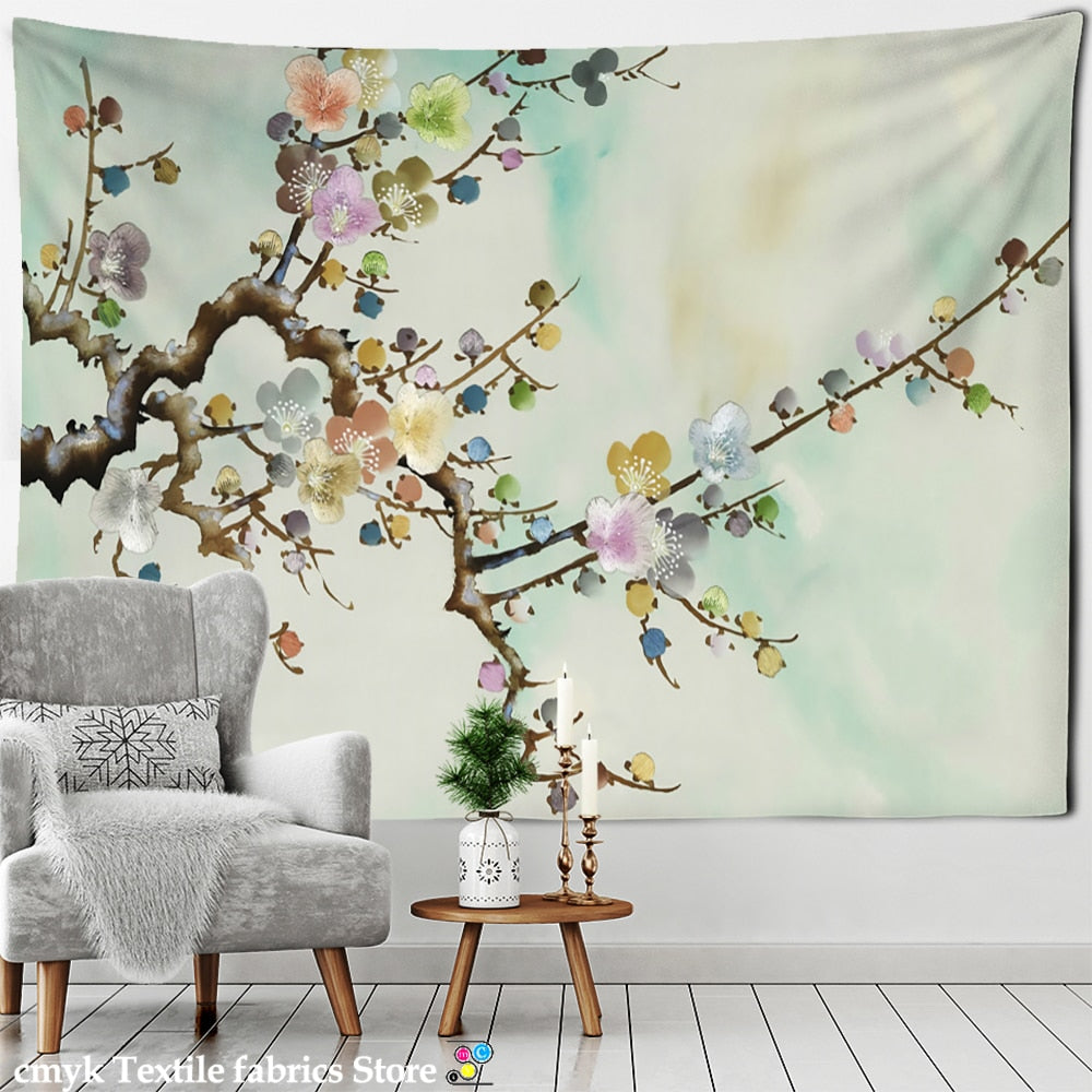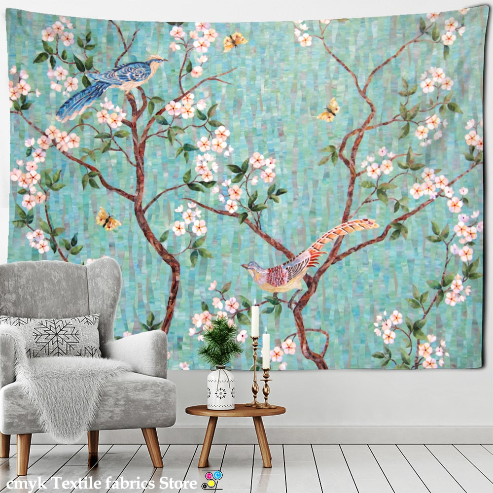 Ink Flower And Bird Painting Tapestry Wall Hanging Bohemian Style Psychedelic Living Room Background Cloth Home Decor