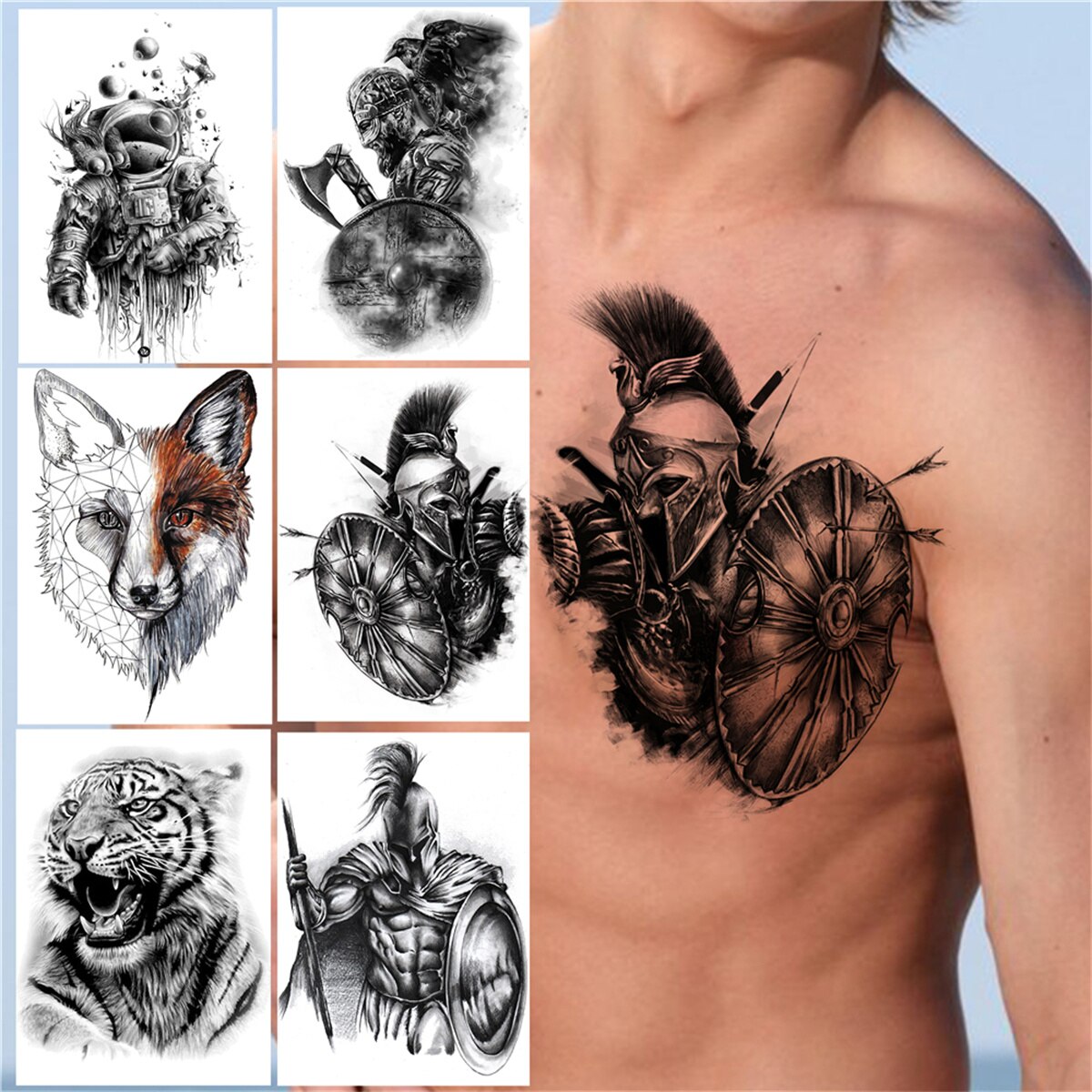 Knight Warrior Temporary Tattoos For Men Women Adult Tiger Fake Wolf Tattoo Sticker Black Astronaut Body Art Painting Tatoos