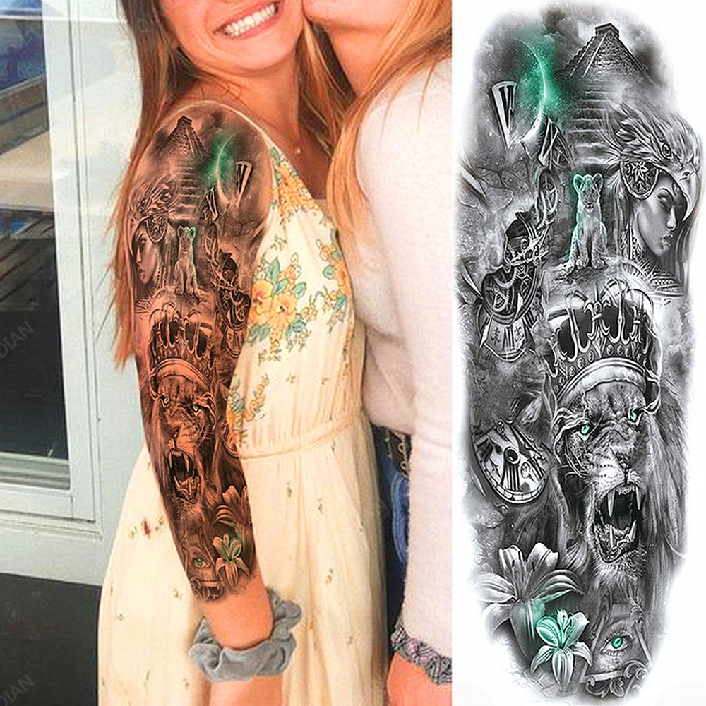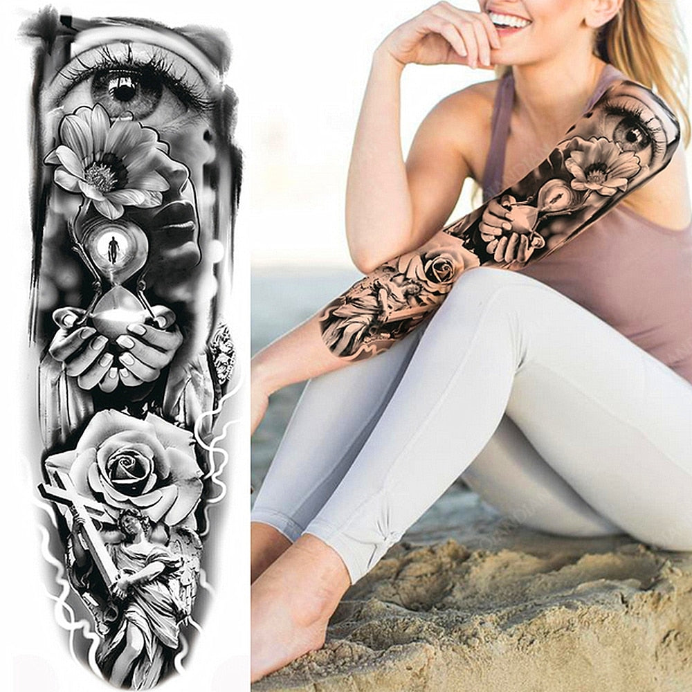 Large Arm Sleeve Tattoo Rose Lion Wolf Waterproof Temporary Tatto Sticker Flower Clock Waist Leg Body Art Full Fake Tatoo Women
