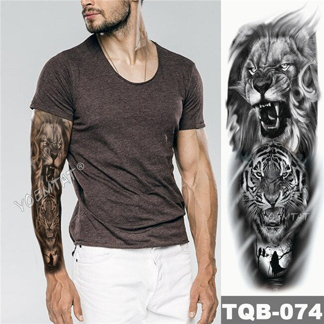Large Arm Sleeve Tattoo Sketch Lion Tiger Waterproof Temporary Tatoo Sticker Wild Fierce Animal Men Full Bird Totem Tatto