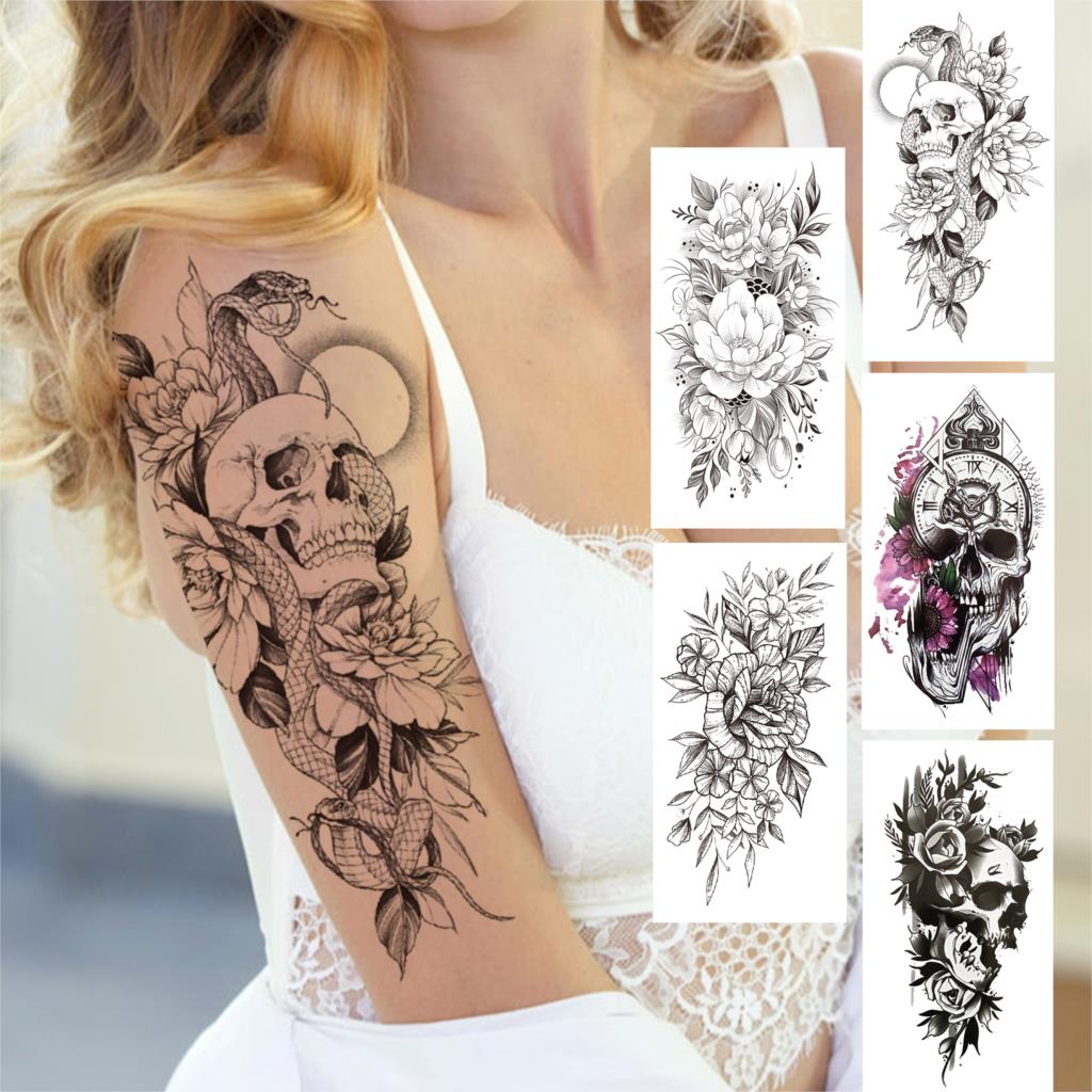 Large Death Skull Snake Flower Temporary Tattoos For Women Men Adult Skeleton Fake Rose Tattoo Sticker Black Peony Body Tatoo