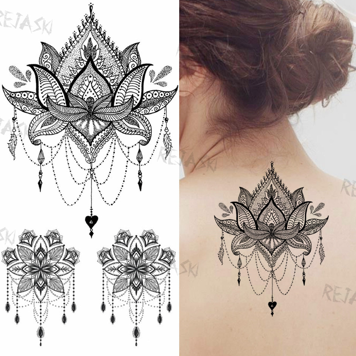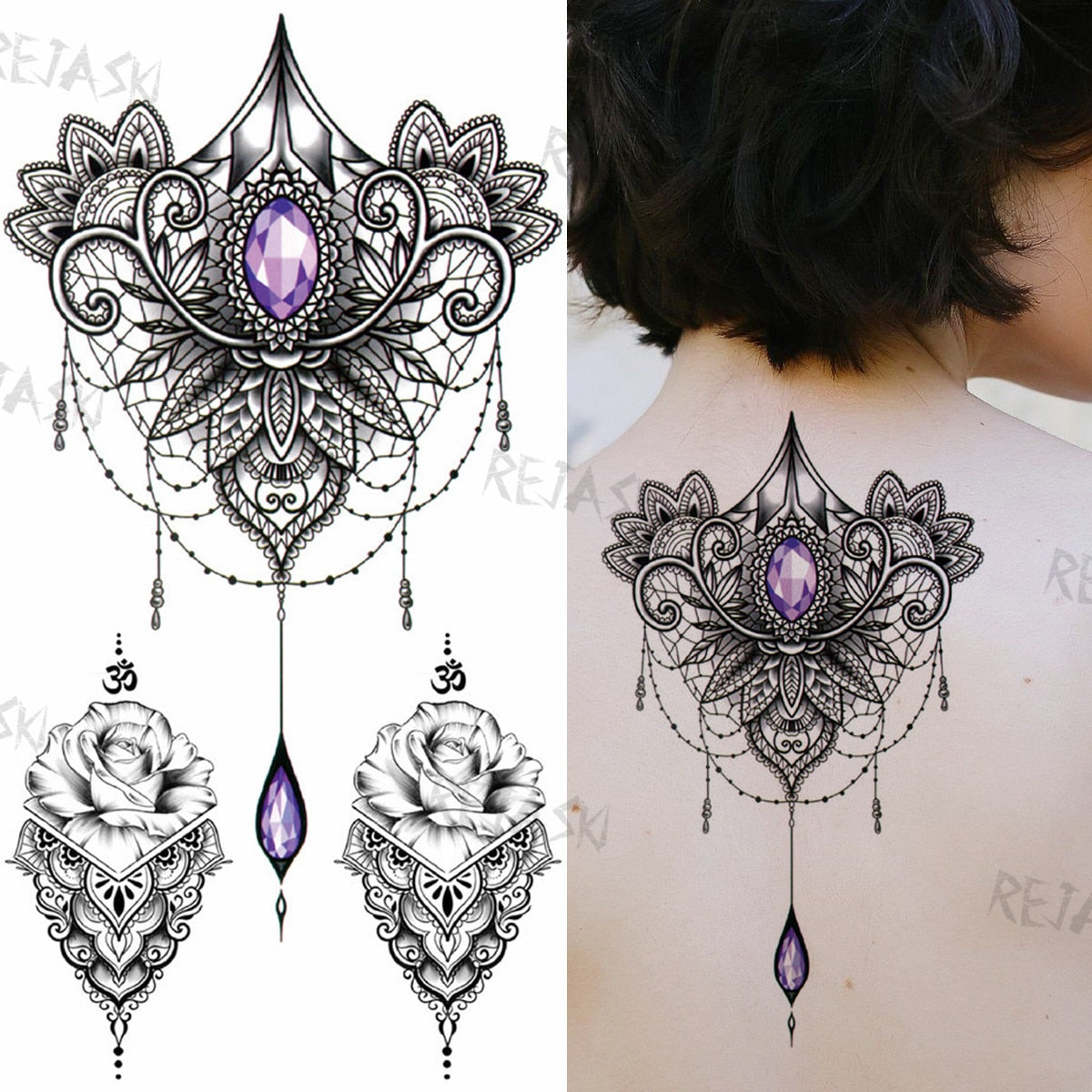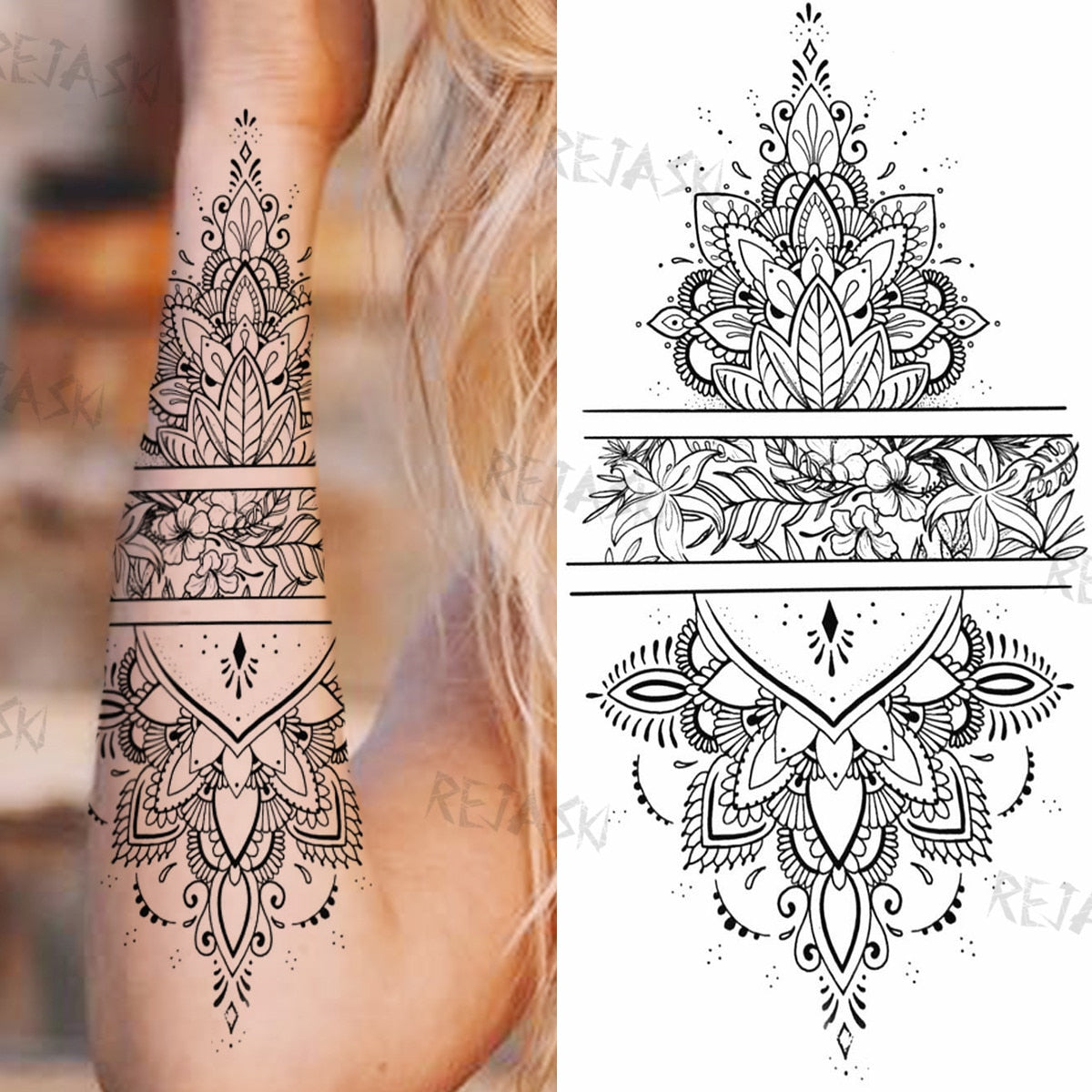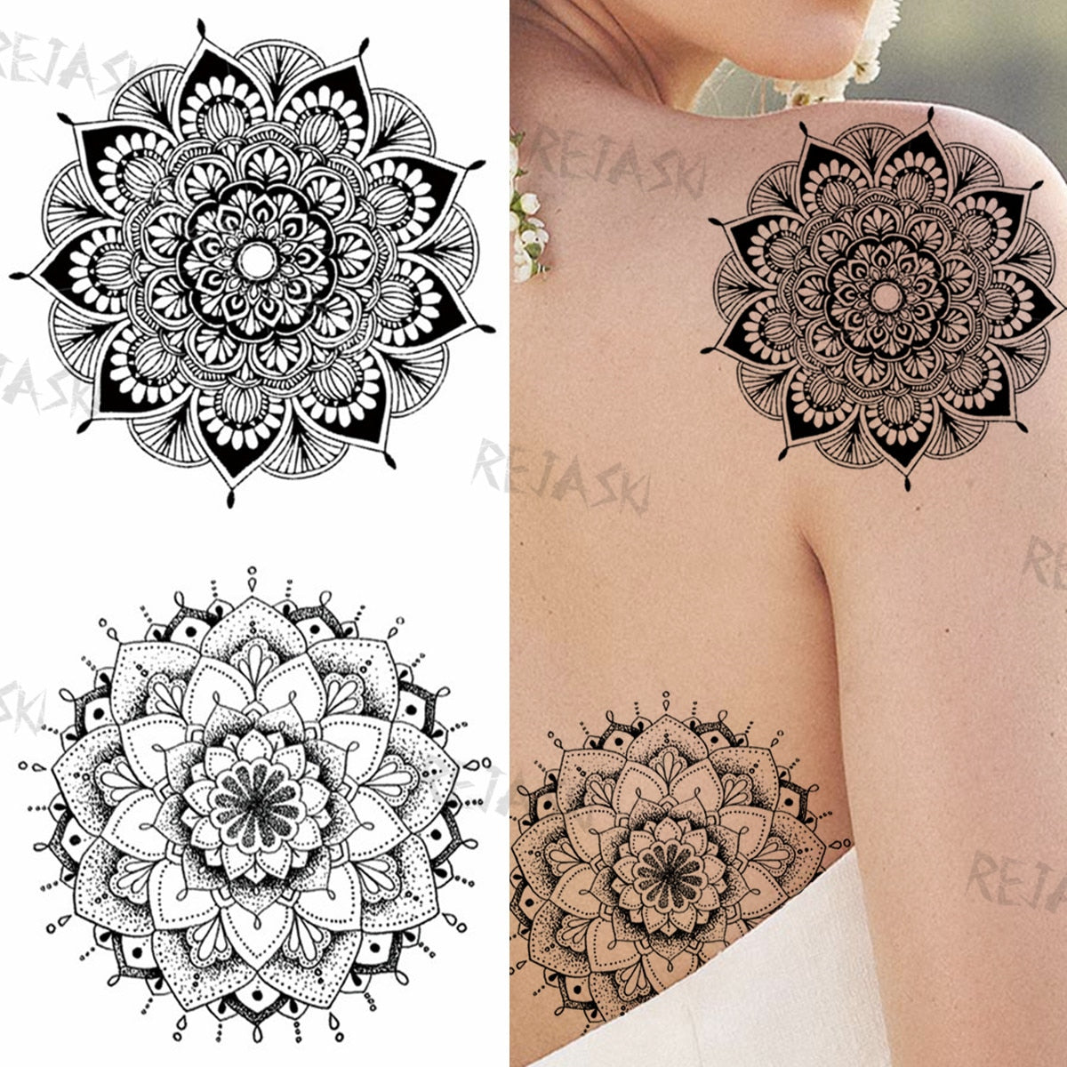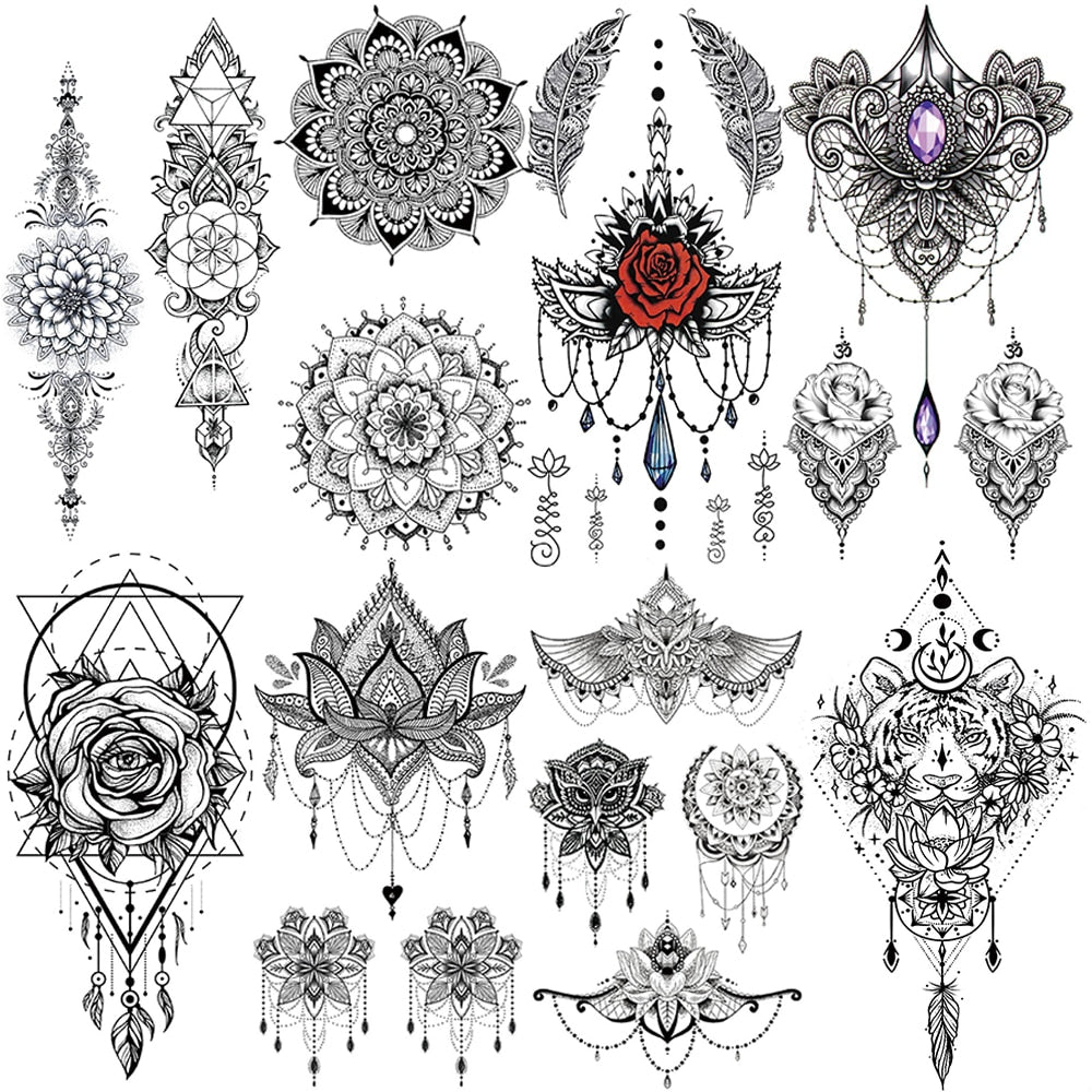 Mandala Flowers Temporary Tattoo For Women Black Henna Mehndi Tattoos Sticker Rose Lace Owl Fake Jewelry Tatoos Body Chest Back
