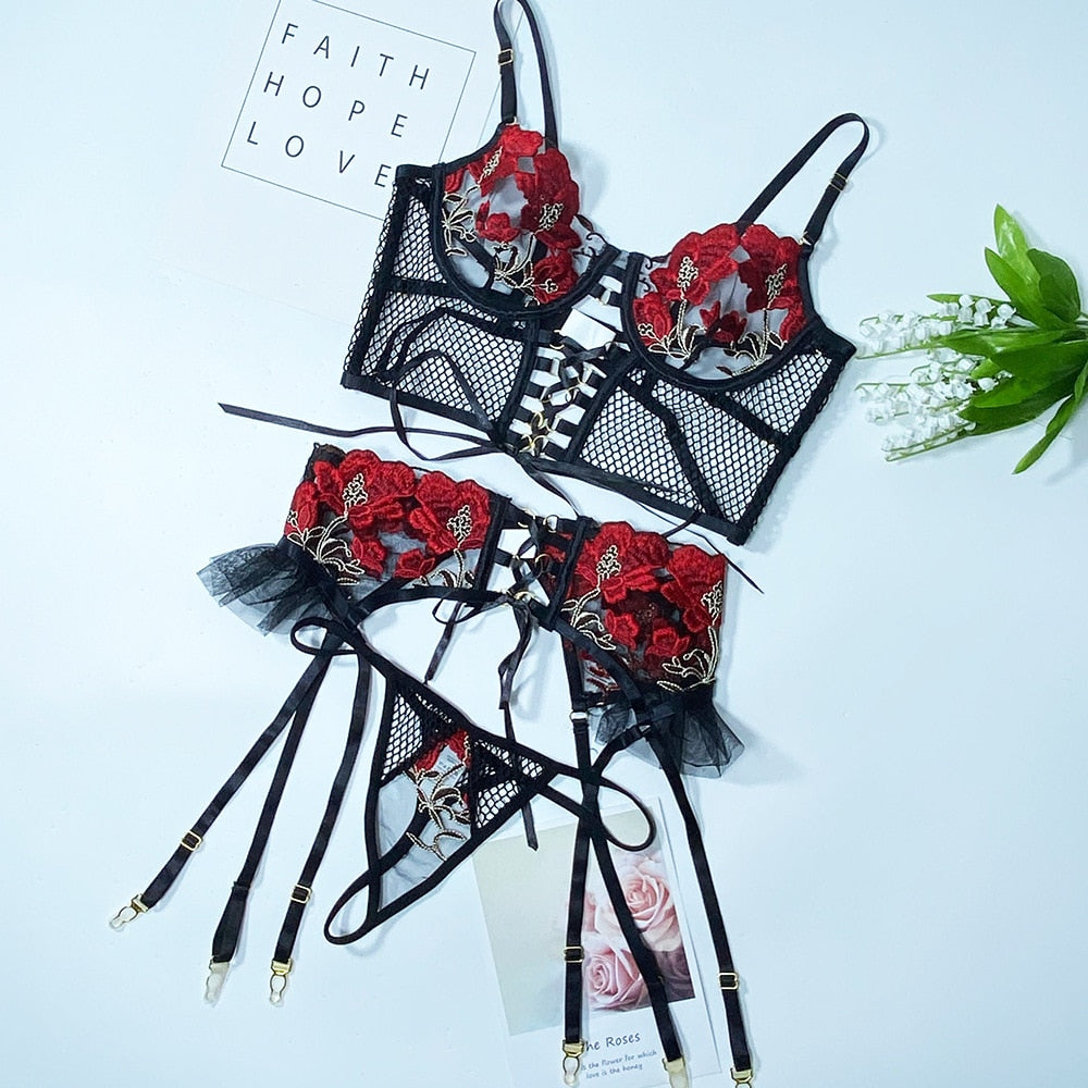 MIRABELLE Erotic Lingerie Bandage Sexy Bra Transparent Underwear Sex Suit Ruffled Garters 3-Piece Fancy Hot Porn Exotic Sets