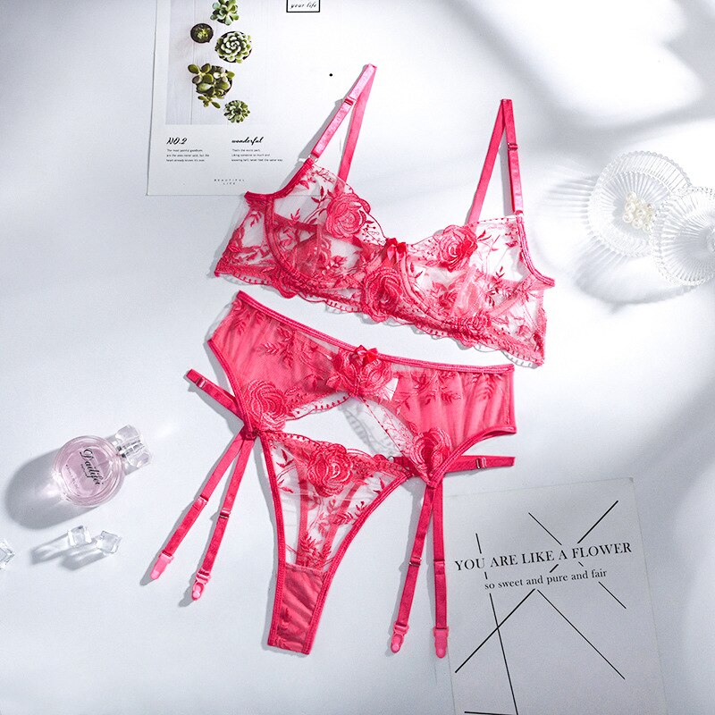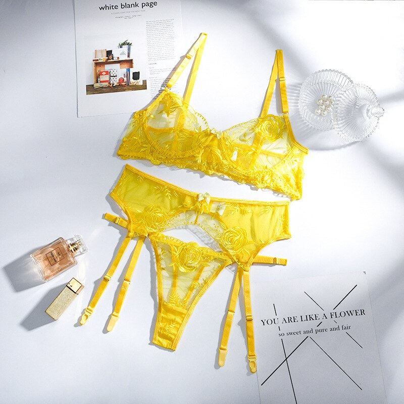MIRABELLE Erotic Lingerie Woman 3-Piece Transparent Set Fancy Embroidery Underwear Brief Set Sexy Lace Bra And Thong Garters Set