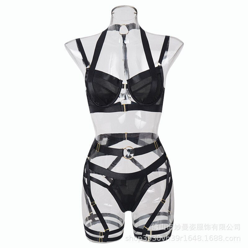 MIRABELLE Gothic Lingerie Sexy Cut Out Bra and Panty Sets Sensual Bandage Erotic Underwear Garters 3-Piece Push Up Brief Sets