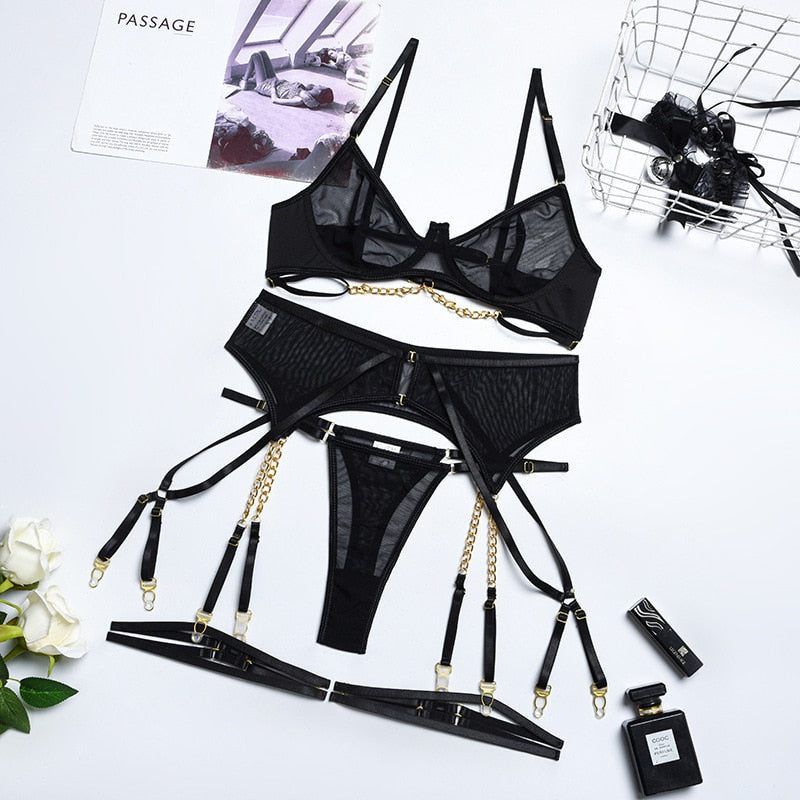 MIRABELLE Sensual Lingerie Sexy Transparent Lace Bra and Thong Garters Underwear Set See Through Erotic Set Hot Porn Exotic Sets