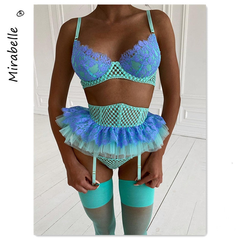 MIRABELLE Sensual Lingerie Woman Lace Embroidery Underwear Push Up Bra Erotic 3 Piece Short Skin Care Kits Blue Setup Ladies