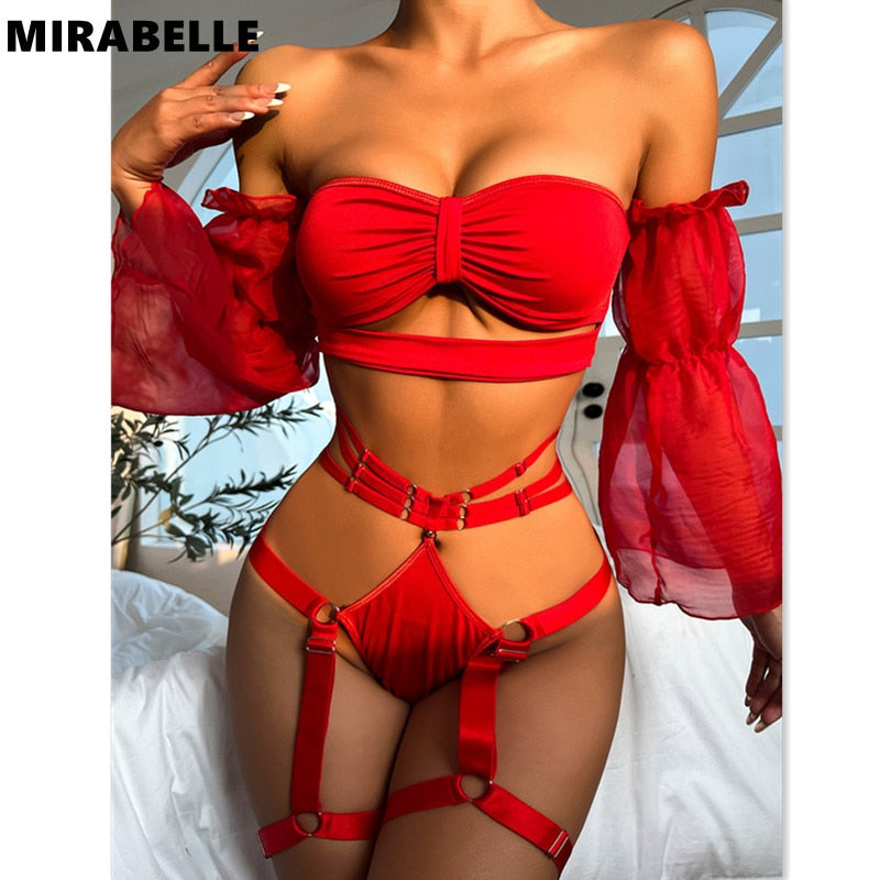 MIRABELLE Set Woman 4 Pieces Push Up Bra Erotic Sets Sensual Bandeau Lingerie with Sleeves Lace Underwear Garters Red Outfits