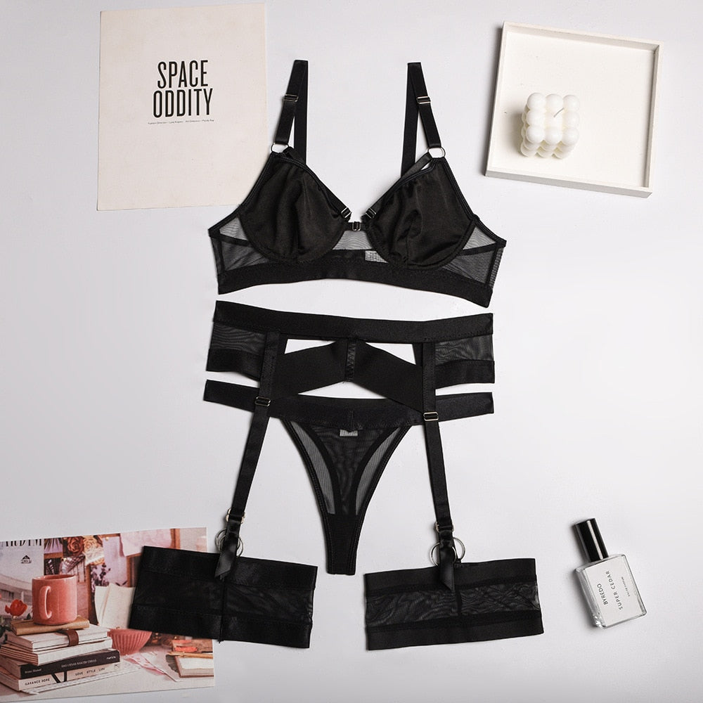 MIRABELLE Sexy Goth Women's Underwear Lingerie Hollow Out Lace Brief Sets 3 Pcs Underwire Bra Erotic Costumes Red Setup Ladies