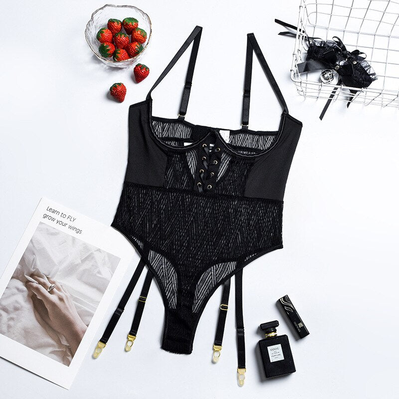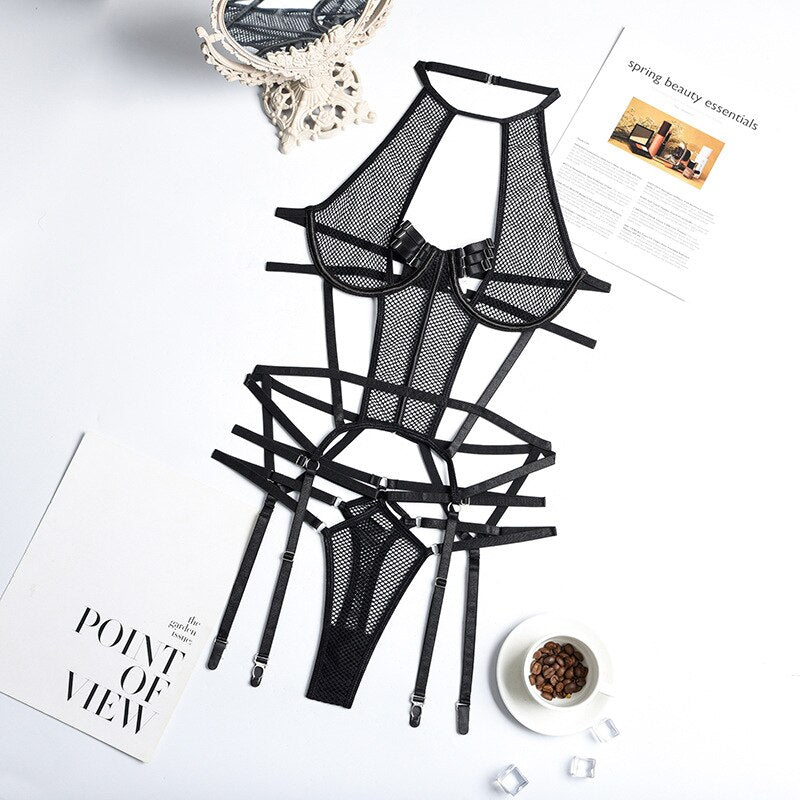 MIRABELLE Sexy Lingerie Deep V Porno Mesh Body See Through Halter Bodysuit Women Metal Chain Exotic Sets Erotic Costumes
