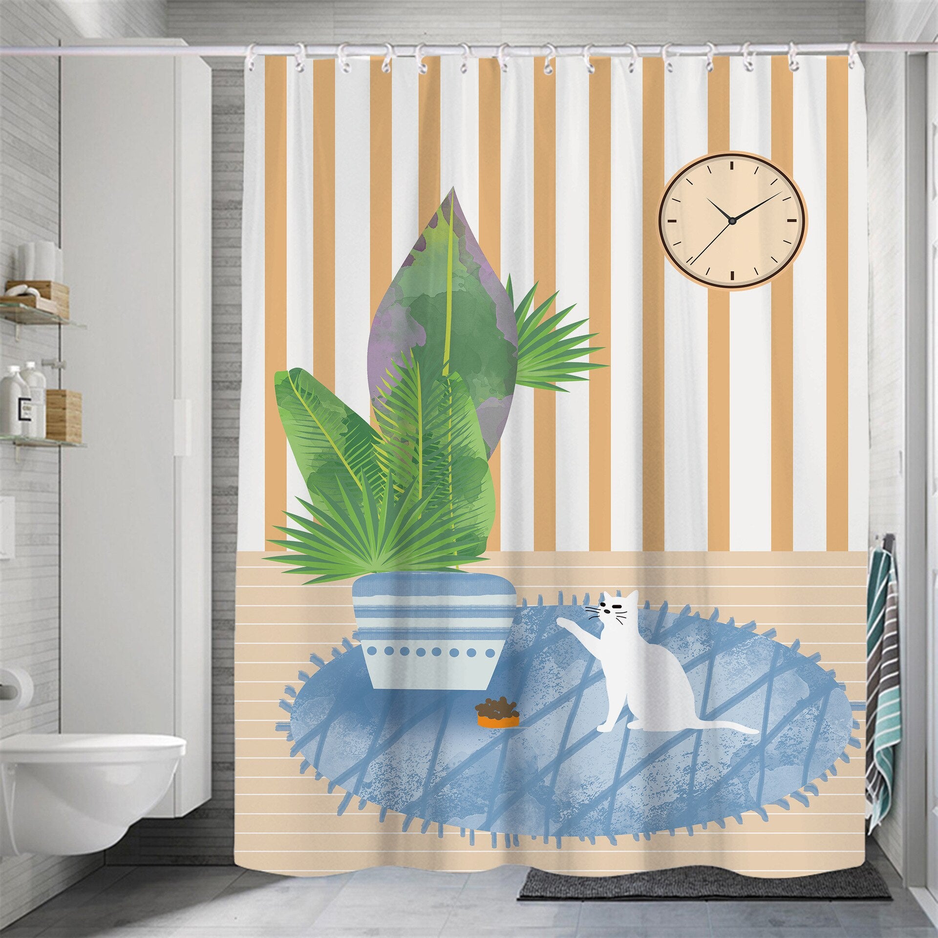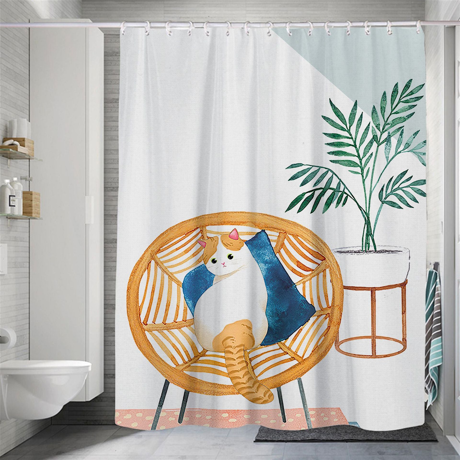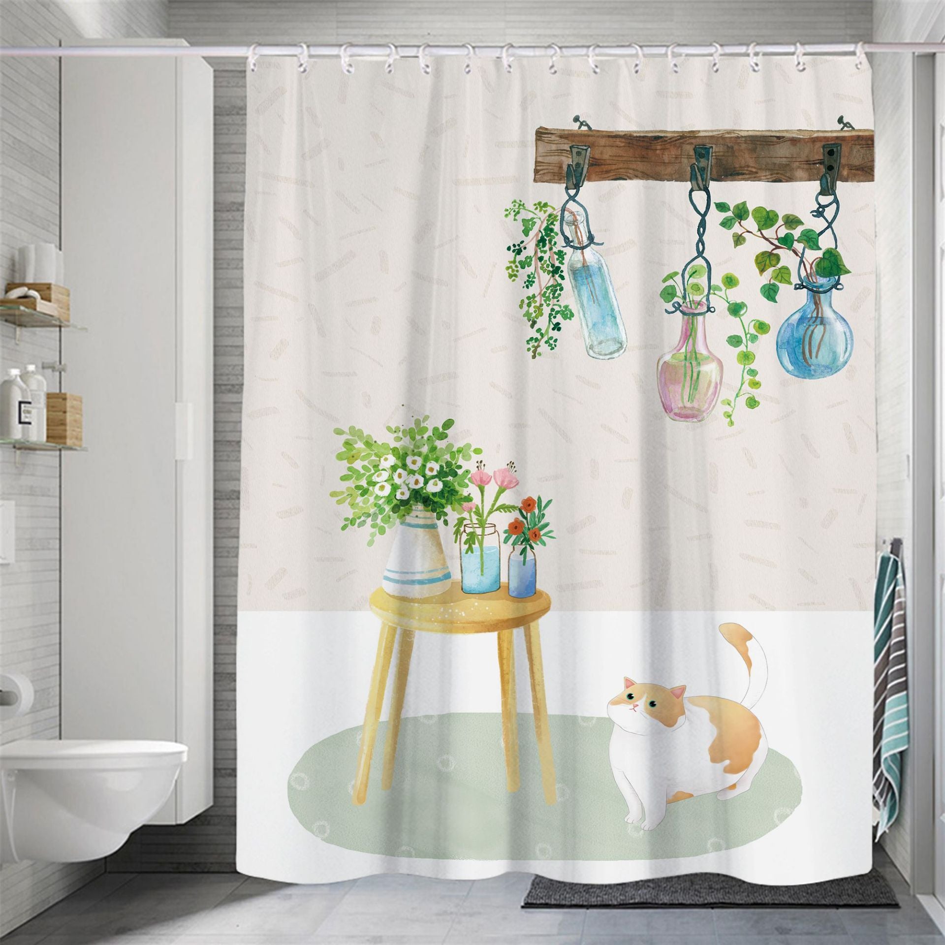Modern Small Fresh Shower Flower Cat Shower Curtain Polyester Frabic Waterproof Polyester Bathroom Curtain with Hooks Home Decor