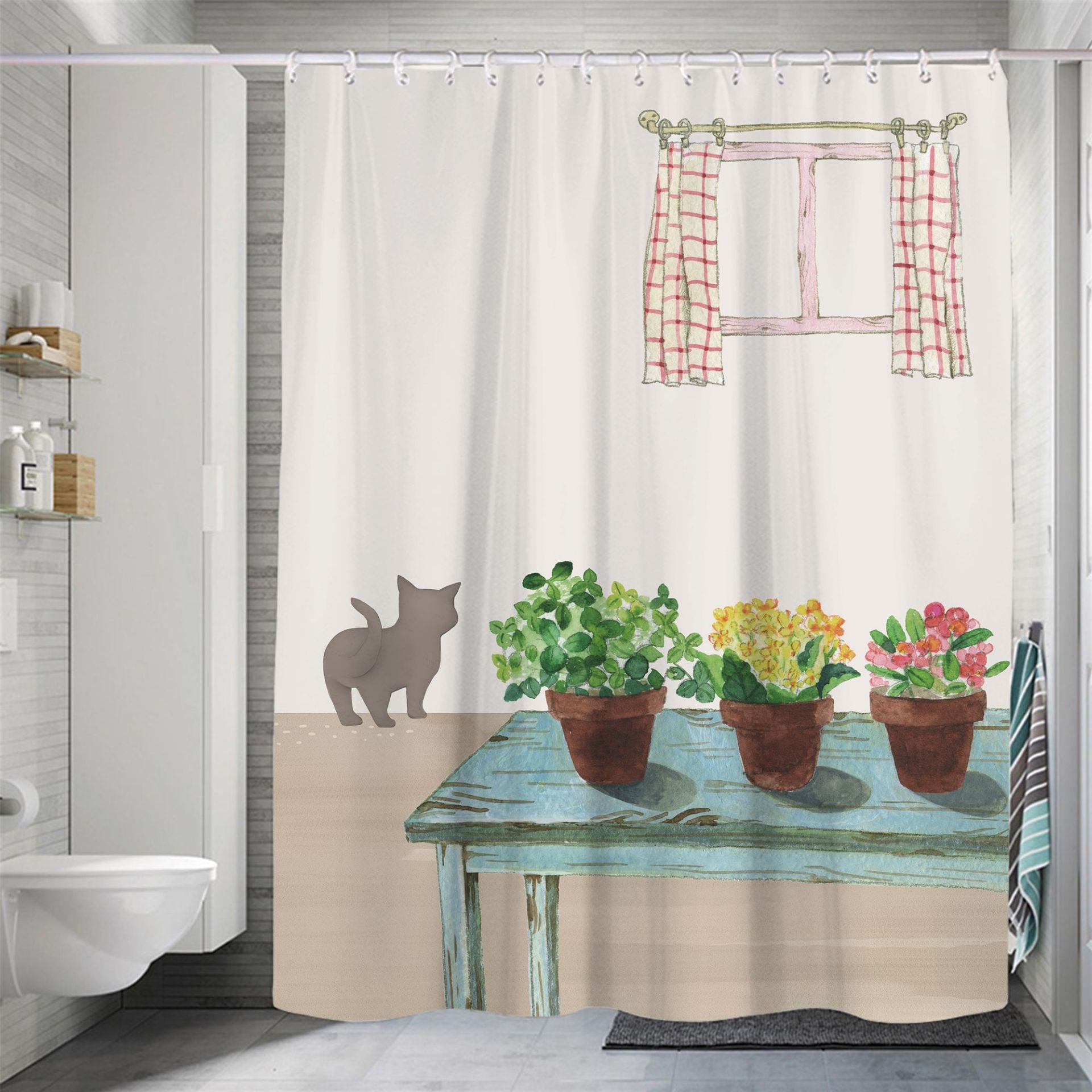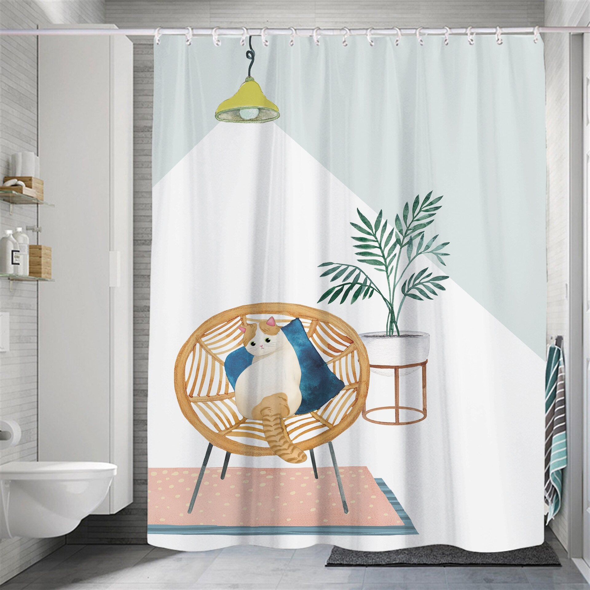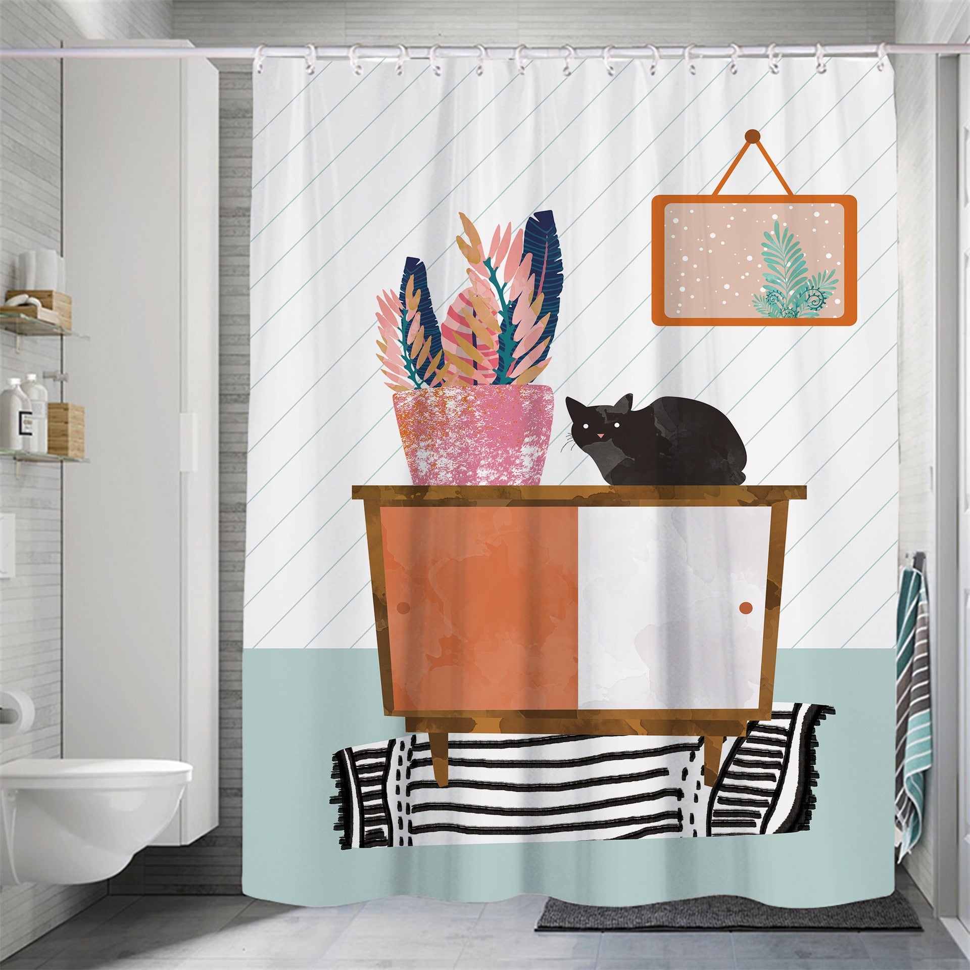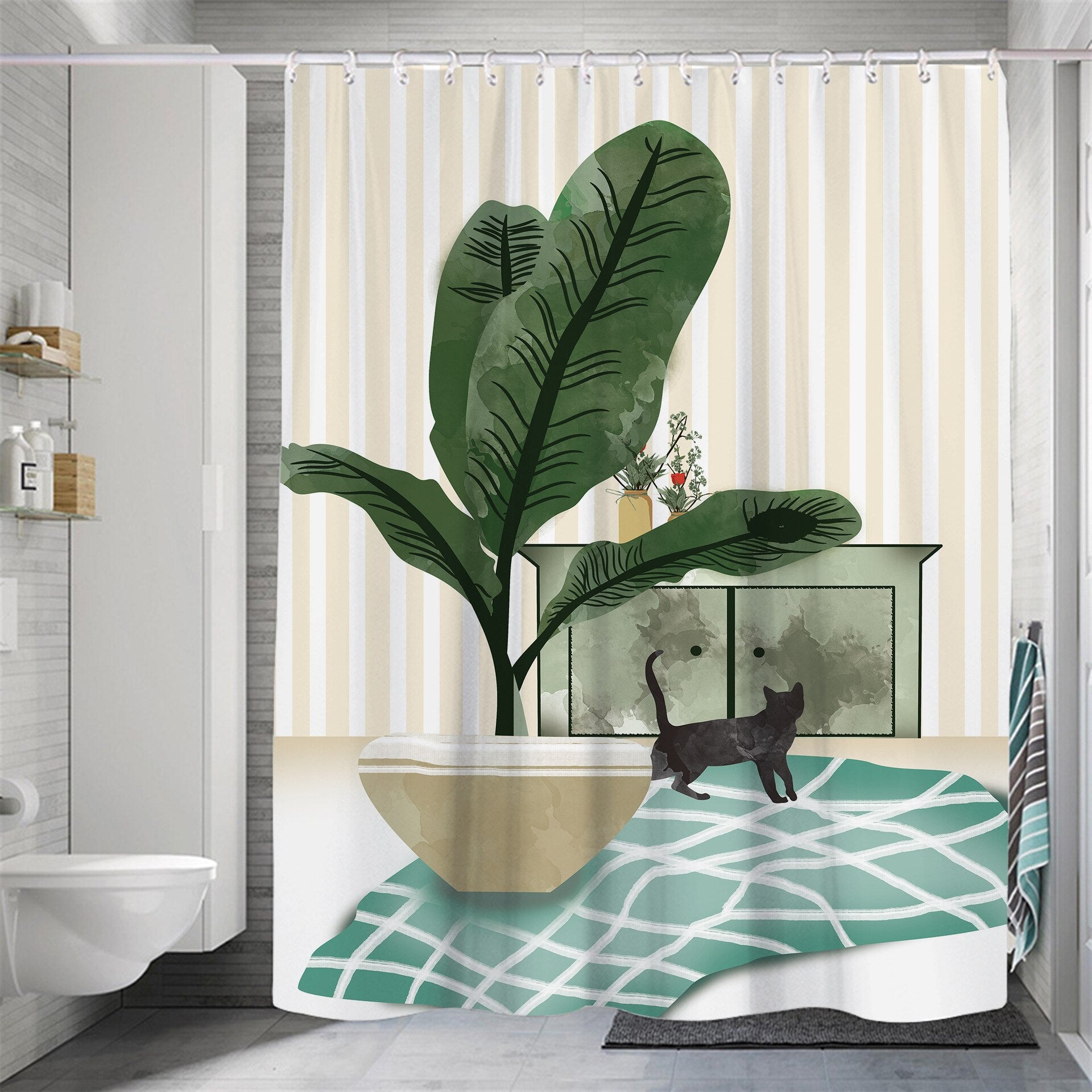 Modern Small Fresh Shower Flower Cat Shower Curtain Polyester Frabic Waterproof Polyester Bathroom Curtain with Hooks Home Decor